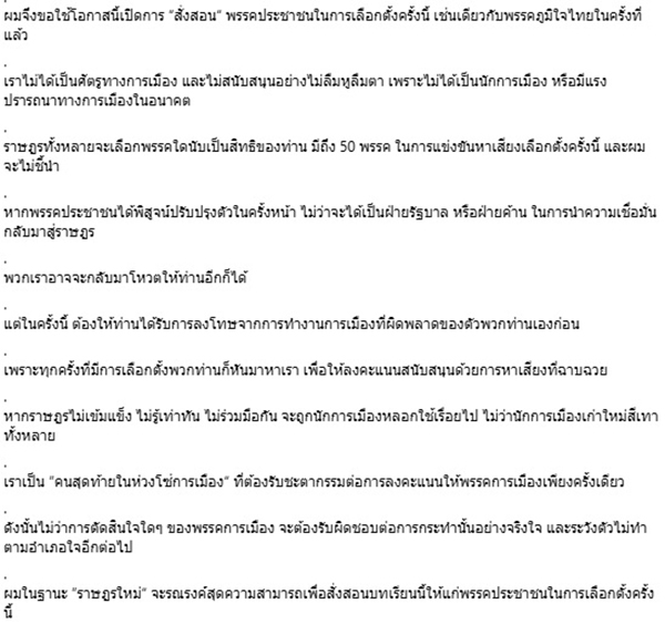 พรรคทำผิดพลาดแล้วกลับมาขอโอกาสซ้ำๆ อีกด้วยนโยบายใหม่ อันจะทำให้พรรคหลงกับอำนาจที่ราษฎรมอบให้ทุกครั้งด้วยโอกาสของราษฎรเพียงแค่หนึ่งครั้งในวันเลือกตั้งเท่านั้น หลังจากนั้นพรรคการเมืองจะทำอย่างไรกับราษฎรก็ได้ ผมจึงขอใช้โอกาสนี้เปิดการ “สั่งสอน“ พรรคประชาชนในการเลือกตั้งครั้งนี้ เช่นเดียวกับพรรคภูมิใจไทยในครั้งที่แล้ว เราไม่ได้เป็นศัตรูทางการเมือง และไม่สนับสนุนอย่างไม่ลืมหูลืมตา เพราะไม่ได้เป็นนักการเมือง หรือมีแรงปรารถนาทางการเมืองในอนาคตราษฎรทั้งหลายจะเลือกพรรคใดนับเป็นสิทธิของท่าน มีถึง 50 พรรค ในการแข่งขันหาเสียงเลือกตั้งครั้งนี้ และผมจะไม่ชี้นำ หากพรรคประชาชนได้พิสูจน์ปรับปรุงตัวในครั้งหน้า ไม่ว่าจะได้เป็นฝ่ายรัฐบาล หรือฝ่ายค้าน ในการนำความเชื่อมั่นกลับมาสู่ราษฎรพวกเราอาจจะกลับมาโหวตให้ท่านอีกก็ได้
