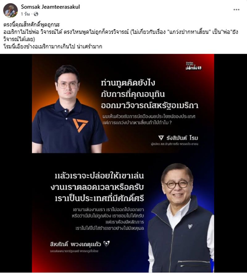 วันที่ 17 มกราคม 2569 นายสมศักดิ์ เจียมธีรสกุล อดีตคณะศิลปศาสตร์ มหาวิทยาลัยธรรมศาสตร์ ผู้ต้องหาคดีมาตรา 112 ปัจจุบันลี้ภัยที่ประเทศฝรั่งเศส โพสต์เฟซบุ๊ก ระบุว่า ตรงนี้คุณสีหศักดิ์พูดถูกนะ อเมริกาไม่ใช่พ่อ วิจารณ์ได้ ตรงไหนพูดไม่ถูกก็ควรวิจารณ์ (ไม่เกี่ยวกับเรื่อง "แกว่งปากหาเสี้ยน" เป็น"พ่อ"ยังวิจารณ์ได้เลย) โรมนี่เอียงข้างอเมริกามากเกินไป น่าเศร้ามาก