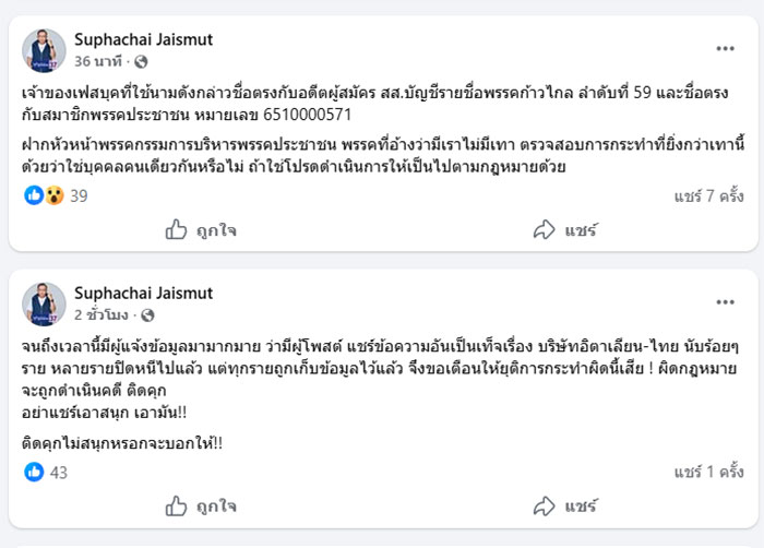 ต่อมา นายศุภชัย โพสต์ข้อความผ่านเฟซบุ๊ก ระบุว่า "จนถึงเวลานี้มีผู้แจ้งข้อมูลมามากมาย ว่ามีผู้โพสต์ แชร์ข้อความอันเป็นเท็จเรื่อง บริษัทอิตาเลียน-ไทย นับร้อยๆราย หลายรายปิดหนีไปแล้ว แต่ทุกรายถูกเก็บข้อมูลไว้แล้ว จึงขอเตือนให้ยุติการกระทำผิดนี้เสีย ! ผิดกฎหมายจะถูกดำเนินคดี ติดคุก อย่าแชร์เอาสนุก เอามัน!! ติดคุกไม่สนุกหรอกจะบอกให้!!"