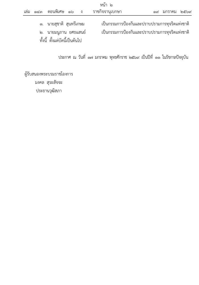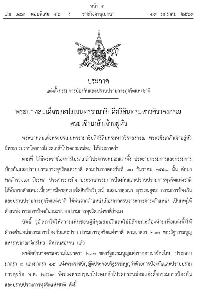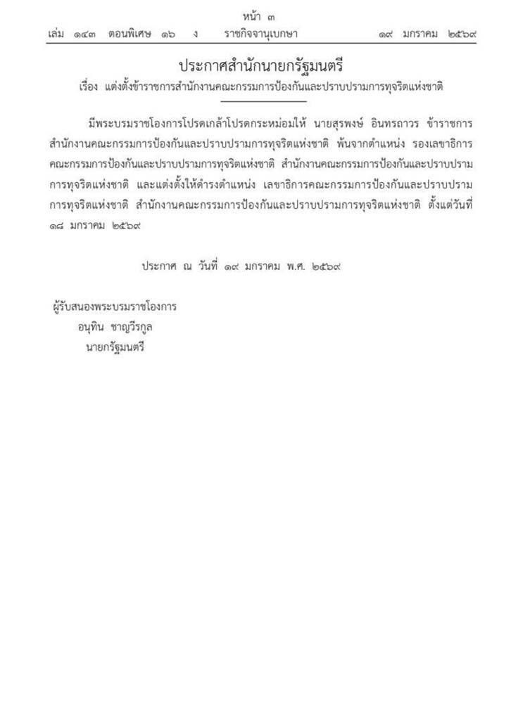 และแต่งตั้งให้ดำรงตำแหน่ง เลขาธิการคณะกรรมการป้องกันและปราบปรามการทุจริตแห่งชาติ สำนักงานคณะกรรมการป้องกันและปราบปรามการทุจริตแห่งชาติ ตั้งแต่วันที่ 18 มกราคม 2569ประกาศ ณ วันที่ 19 มกราคม พ.ศ. 2569 ผู้รับสนองพระบรมราชโองการ อนุทิน ชาญวีรกูล นายกรัฐมนตรี