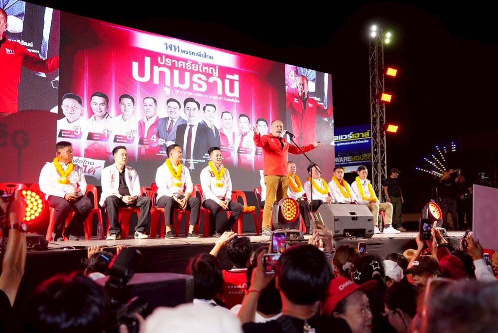 วันที่ 19 มกราคม 2569 ที่ลานกินซ่า โลตัสรังสิต อ.ธัญบุรี ปทุมธานี พรรคเพื่อไทยเปิดเวทีปราศรัย นำโดยนายยศชนัน วงศ์สวัสดิ์ แคนดิเดตนายกรัฐมนตรี พรรคเพื่อไทย ขึ้นเวทีปราศรัย ช่วยผู้สมัคร สส. ปทุมธานี 8 เขต นายณัฐวุฒิ ใสยเกื้อ ผู้อำนวยการครอบครัวเพื่อไทย และแกนนำพรรคเพื่อไทยร่วมปราศรัย นายแพทองธาร ชินวัตร ขึ้นเวทีให้กำลังใจ มีชาวปทุมธานีรอฟังส่งเสียงเชียร์ลั่นเต็มลาน