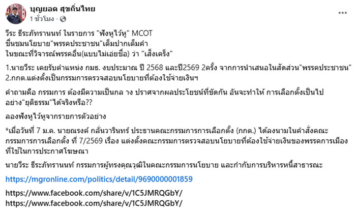 เมื่อวันที่ 20 มกราคม 2569 นายบุญยอด สุขถิ่นไทย อดีต สส.พรรคประชาธิปัตย์ (ปชป.) โพสต์ข้อความผ่านเฟซบุ๊ก ระบุว่า วีระ ธีระภัทรานนท์ ในรายการ "ฟังหูไว้หู" MCOT
