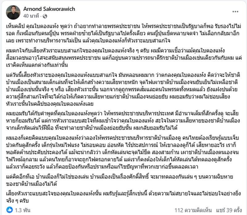 ผมยอมรับได้กับคำพูดที่คุณใบตองแห้งพูดว่า ให้พรรคประชาชนบริหารประเทศ มีอำนาจเต็มที่สักครั้งดู จะเสียหายก็ยอมรับได้ แต่การหัวเราะแบบสะใจที่ผมเข้าใจว่าคุณใบตองแห้ง สะใจในความเสียหายของชาติบ้านเมือง จากเด็กหัดเล่นไร้ฝีมือ ที่จะทำลายชาติบ้านเมืองย่อยยับนั้น ผมกลับยอมรับไม่ได้