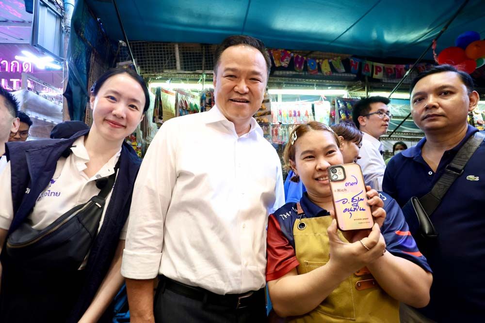 ขณะเดียวกันระหว่างเดินภายในตลาดแม่ค้าร้านหนึ่งตะโกนบอกว่า “ขอคนละครึ่งเพิ่มได้ไหม” นายอนุทินตอบว่า “ได้ๆแน่นอน” ทั้งนี้ ระหว่างเดิน ทักทายพ่อค้าแม่ค้าภายในตลาด นายอนุทินสอบถามร้านขายของว่า “ขายดีไหม” ซึ่งพ่อค้าตอบว่า “ขายได้” ทั้งนี้ระหว่างเดินนายอนุทินได้แวะเข้าไปตามร้านต่างๆ โดยมีร้านหนึ่งได้ติดสติกเกอร์รูปหัวใจที่บริเวณหน้าอกเสื้อของนายอนุทินด้วย