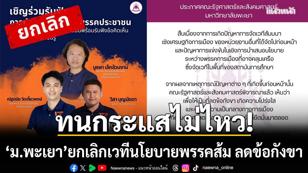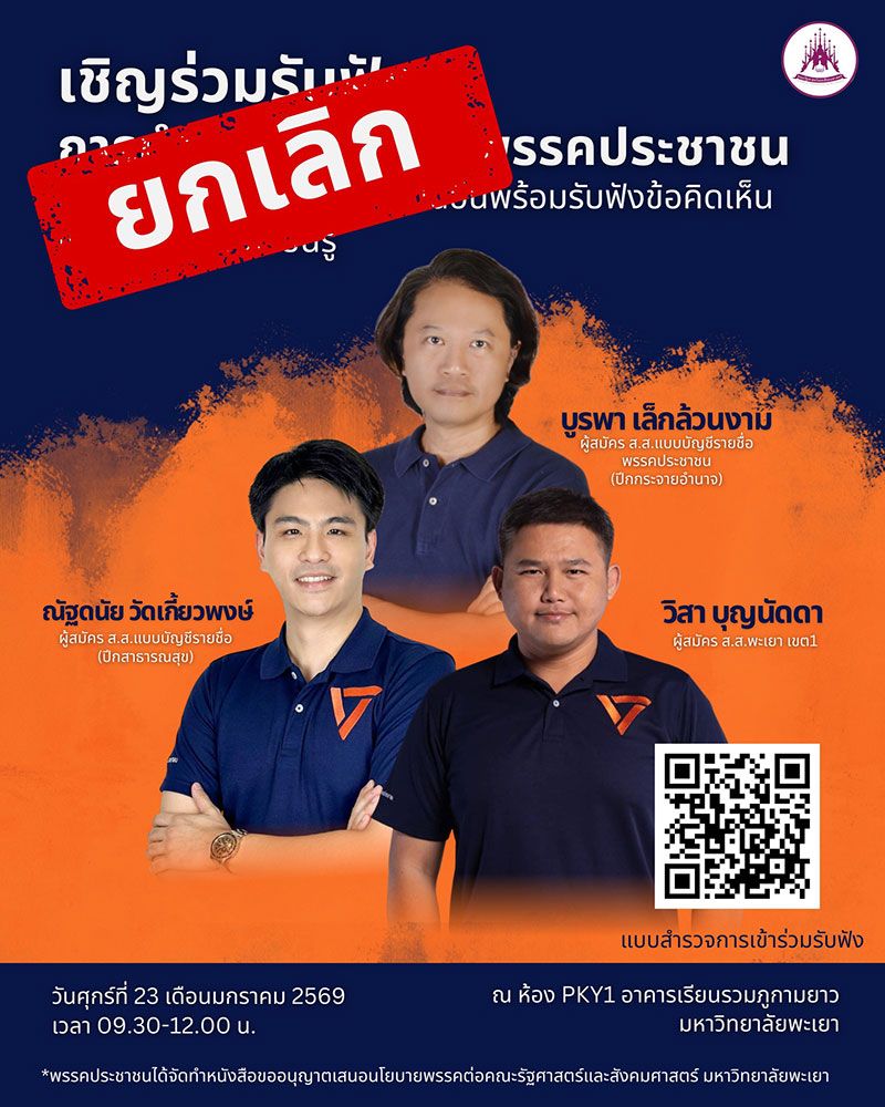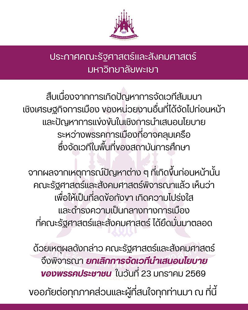 ล่าสุด คณะรัฐศาสตร์และสังคมศาสตร์ ได้พิจารณา ยกเลิกการจัดเวทีนำเสนอ นโยบายของพรรคประชาชน ในวันที่ 23 มกราคม 2569