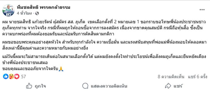 โดยระบุว่า ผม นายชลสิทธิ แก้วยะรัตน์ ผู้สมัคร สส. ภูเก็ต เขตเลือกตั้งที่ 2 หมายเลข 1 ขอกราบขอโทษพี่น้องประชาชนชาวภูเก็ตทุกท่าน จากใจจริง กรณีที่ผมถูกให้ถอนชื่อจากการลงสมัคร เนื่องจากขาดคุณสมบัติ กรณีถือหุ้นสื่อ ซึ่งเป็นความบกพร่องที่ผมต้องยอมรับและน้อมรับการตัดสินตามกติกา