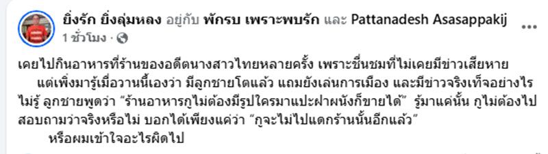 แต่เพิ่งมารู้เมื่อวานนี้เองว่า มีลูกชายโตแล้ว แถมยังเล่นการเมือง และมีข่าวจริงเท็จอย่างไรไม่รู้ ลูกชายพูดว่า “ร้านอาหารกูไม่ต้องมีรูปใครมาแปะฝาผนังก็ขายได้” รู้มาแค่นั้น กูไม่ต้องไปสอบถามว่าจริงหรือไม่ บอกได้เพียงแค่ว่า “กูจะไม่ไปแดกร้านนั้นอีกแล้ว” หรือผมเข้าใจอะไรผิดไป