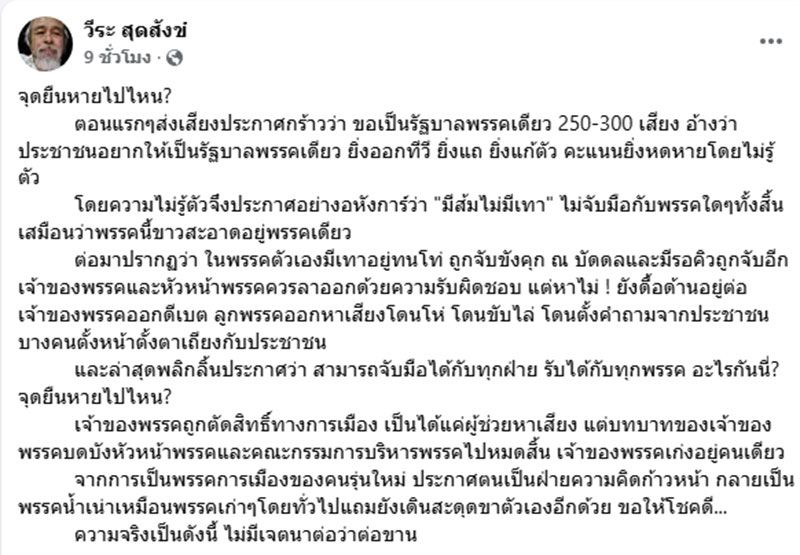และล่าสุดพลิกลิ้นประกาศว่า สามารถจับมือได้กับทุกฝ่าย รับได้กับทุกพรรค อะไรกันนี่? จุดยืนหายไปไหน?