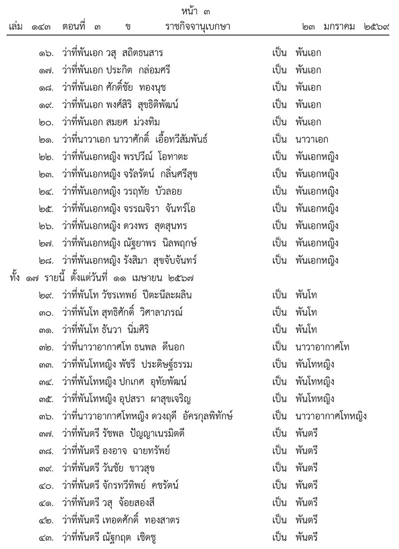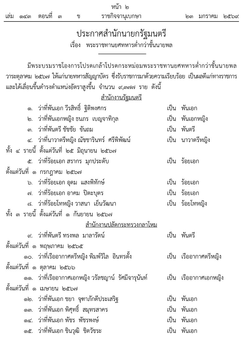 วันที่ 24 มกราคม 2569 เว็บไซต์ราชกิจจานุเบกษา เผยแพร่ประกาศสำนักนายกรัฐมนตรี เรื่อง พระราชทานยศทหารต่ำกว่าชั้นนายพล