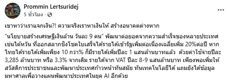 วันที่ 24 มกราคม 2569 นพ.พรหมินทร์ เลิศสุริย์เดช อดีตเลขาธิการนายกรัฐมนตรี ในฐานะแกนนำพรรคเพื่อไทย โพสต์ข้อความถึง นโยบาย ‘สร้างเศรษฐีเงินล้าน วันละ 9 คน’