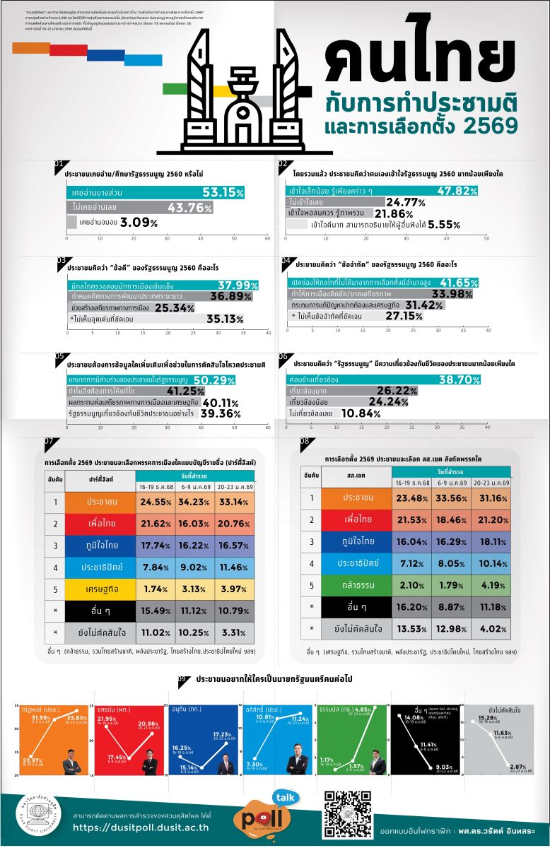 ขณะเดียวกันสวนดุสิตโพล มหาวิทยาลัยสวนดุสิต สำรวจความคิดเห็นประชาชนทั่วประเทศ เรื่อง“คนไทยกับการทำประชามติและการเลือกตั้ง 2569” กลุ่มตัวอย่าง จำนวน 2,269 คน (สำรวจทางออนไลน์และภาคสนาม) ระหว่างวันที่ 20-23 มกราคม 2569 ในประเด็นเกี่ยวกับการทำประชามติ