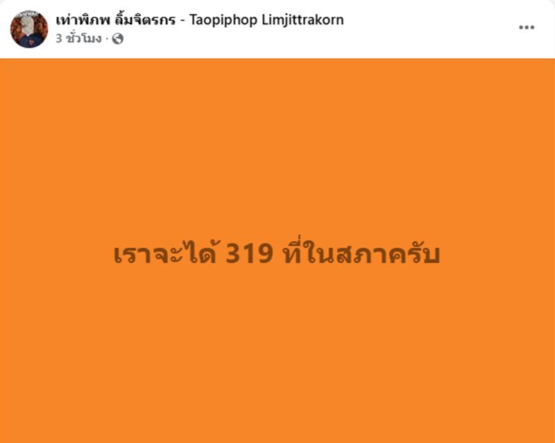ล่าสุด นายเท่าพิภพ ลิ้มจิตรกร ผู้สมัครสส.กทม.เขต 33 พรรคประชาชน ได้โพสต์ข้อความสั้นๆ ระบุว่า "เราจะได้ 319 ที่ในสภาครับ"