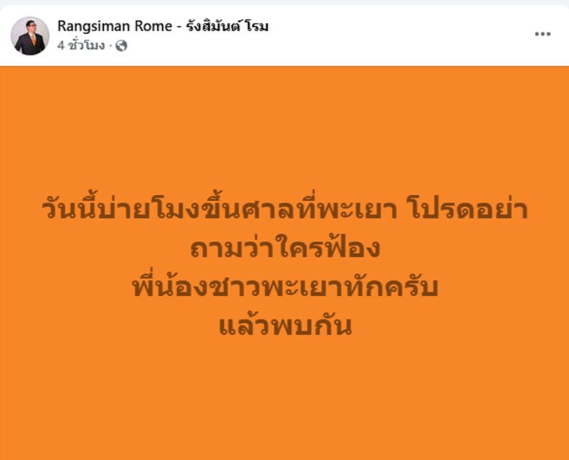 ขณะเดี่ยวกันเช้าวันนี้ นายรังสิมันต์ โรม ได้โพสต์ข้อความว่า “วันนี้บ่ายโมงขึ้นศาลที่พะเยา โปรดอย่าถามว่าใครฟ้อง พี่น้องชาวพะเยาทักครับ แล้วพบกัน”
