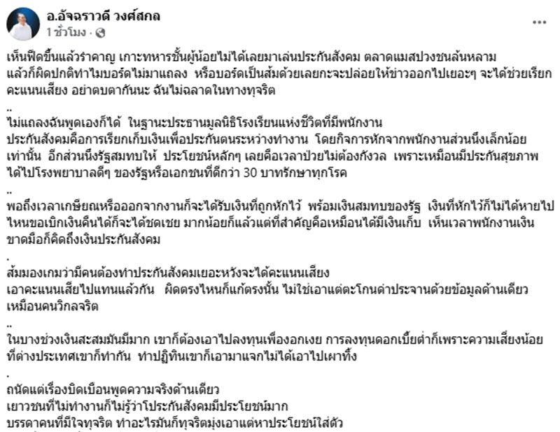 วันที่ 27 มกราคม 2569 อาจารย์อ้อย อัจฉราวดี วงศ์สกล ประธานมูลนิธิโรงเรียนแห่งชีวิต และมูลนิธิโนอิ้ง บุดด้า เป็นอีกบุคคลหนึ่งที่ต้องยกให้เป็น อินฟลูเอนเซอร์ ที่ออกมาแสดงจุดยืนแถวหน้าในฝ่ายของผู้รักชาติ โพสต์ข้อความระบุว่า เห็นฟีดขึ้นแล้วรำคาญ เกาะทหารชั้นผู้น้อยไม่ได้เลยมาเล่นประกันสังคม ตลาดแมสปวงชนล้นหลาม แล้วก็ผิดปกติทำไมบอร์ดไม่มาแถลง หรือบอร์ดเป็นส้มด้วยเลยกะจะปล่อยให้ข่าวออกไปเยอะๆ จะได้ช่วยเรียกคะแนนเสียง อย่าตบตากันนะ ฉันไม่ฉลาดในทางทุจริต