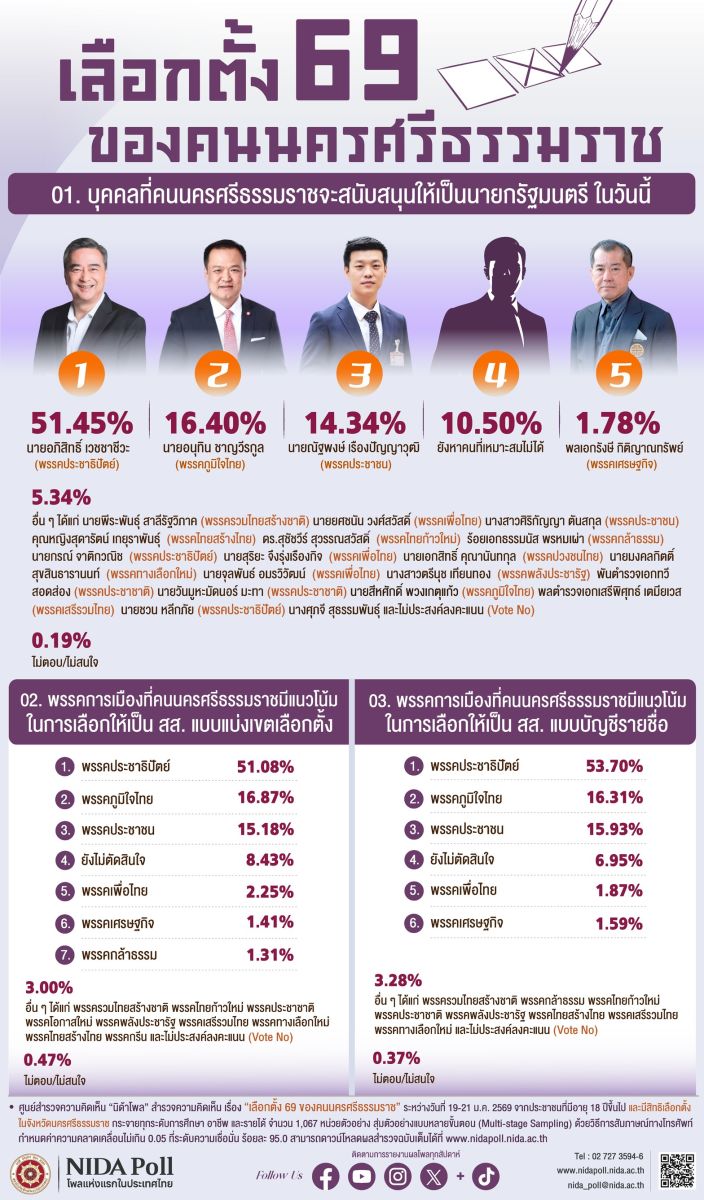 เมื่อวันที่ 27มกราคม 2569ศูนย์สำรวจความคิดเห็นนิด้าโพลสถาบันบัณฑิตพัฒนบริหารศาสตร์ (นิด้า) เปิดเผยผลการสำรวจ เรื่อง “เลือกตั้ง 69 ของคนนครศรีธรรมราช” ทำการสำรวจระหว่างวันที่ 19- 21 มกราคม 2569 จากประชาชนที่มีอายุ 18 ปีขึ้นไป และมีสิทธิเลือกตั้งในจังหวัดนครศรีธรรมราช กระจายทุกระดับการศึกษา อาชีพ และรายได้ รวมจำนวนทั้งสิ้น 1,067 หน่วยตัวอย่าง เกี่ยวกับการเลือกตั้ง ปี 69 ของคนจังหวัดนครศรีธรรมราชการสำรวจอาศัย การสุ่มตัวอย่างโดยใช้ความน่าจะเป็นจากบัญชีรายชื่อฐานข้อมูลตัวอย่างหลัก (Master Sample) ของ “นิด้าโพล” สุ่มตัวอย่างแบบหลายขั้นตอน (Multi-stage Sampling) เก็บข้อมูลด้วยวิธีการสัมภาษณ์ทางโทรศัพท์ โดยกำหนด ค่าความคลาดเคลื่อนไม่เกิน 0.05 ที่ระดับความเชื่อมั่น ร้อยละ 95.0