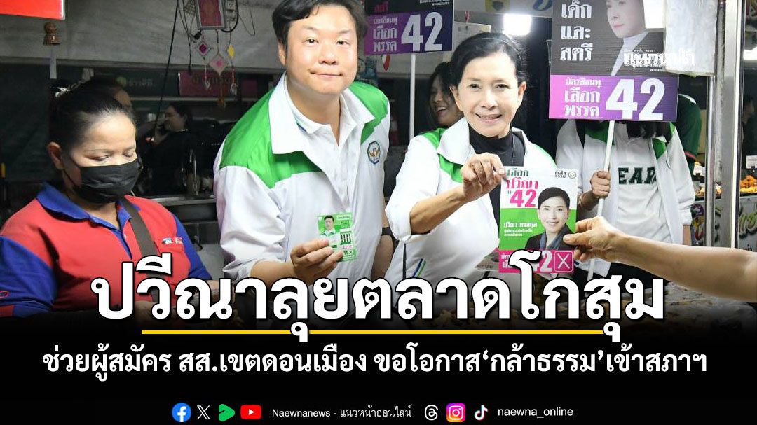 ”ปวีณา“นำคณะลงพื้นที่หาเสียงบริเวณตลาดโกสุม ช่วยผู้สมัคร สส.กทม.พรรคกล้าธรรม เขตดอนเมือง ”ดิษยะฤทธิ์ รู้ดี“ อ้อน 8 กุมภาพันธ์ นี้ขอโอกาสและไว้วางใจ“กล้าธรรม”เข้าสภาฯ