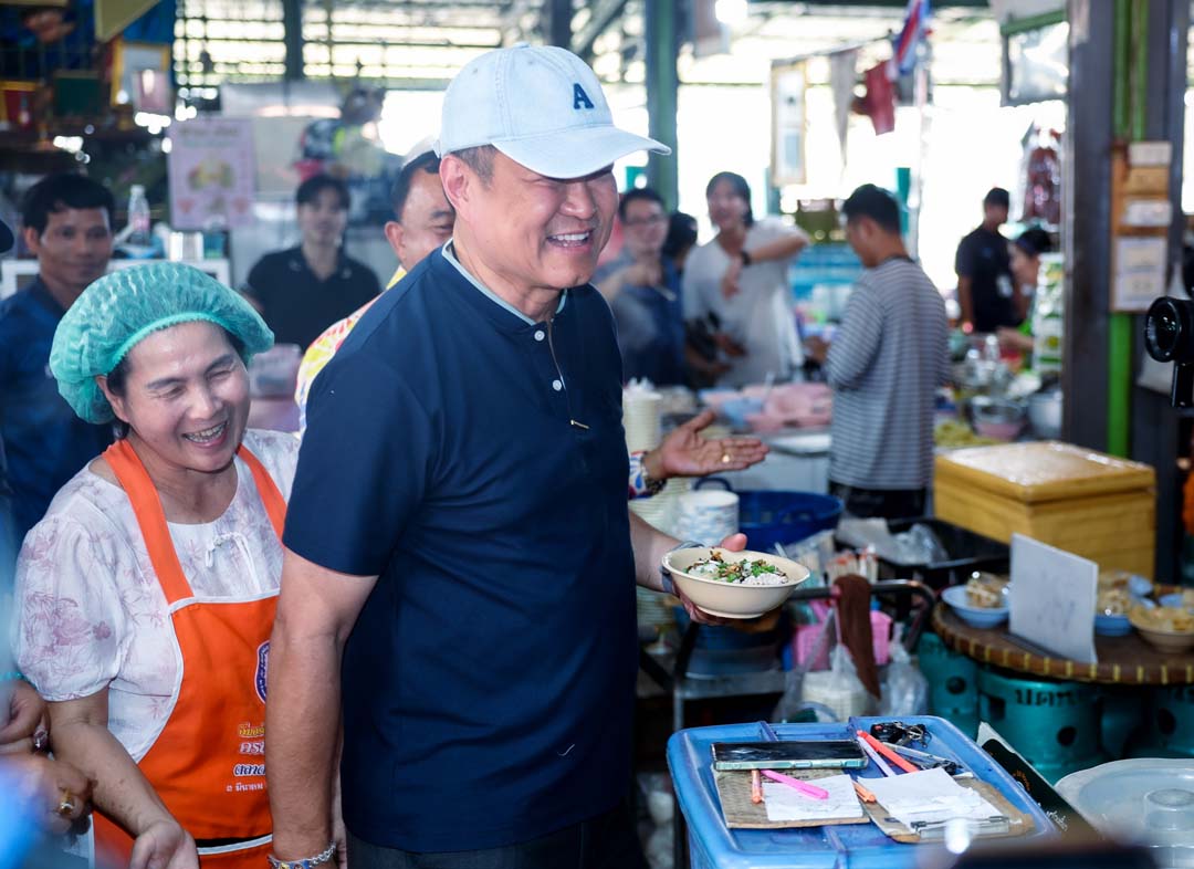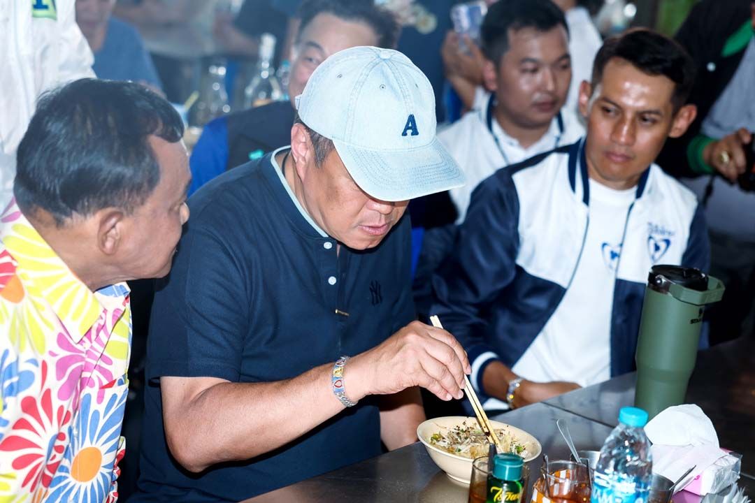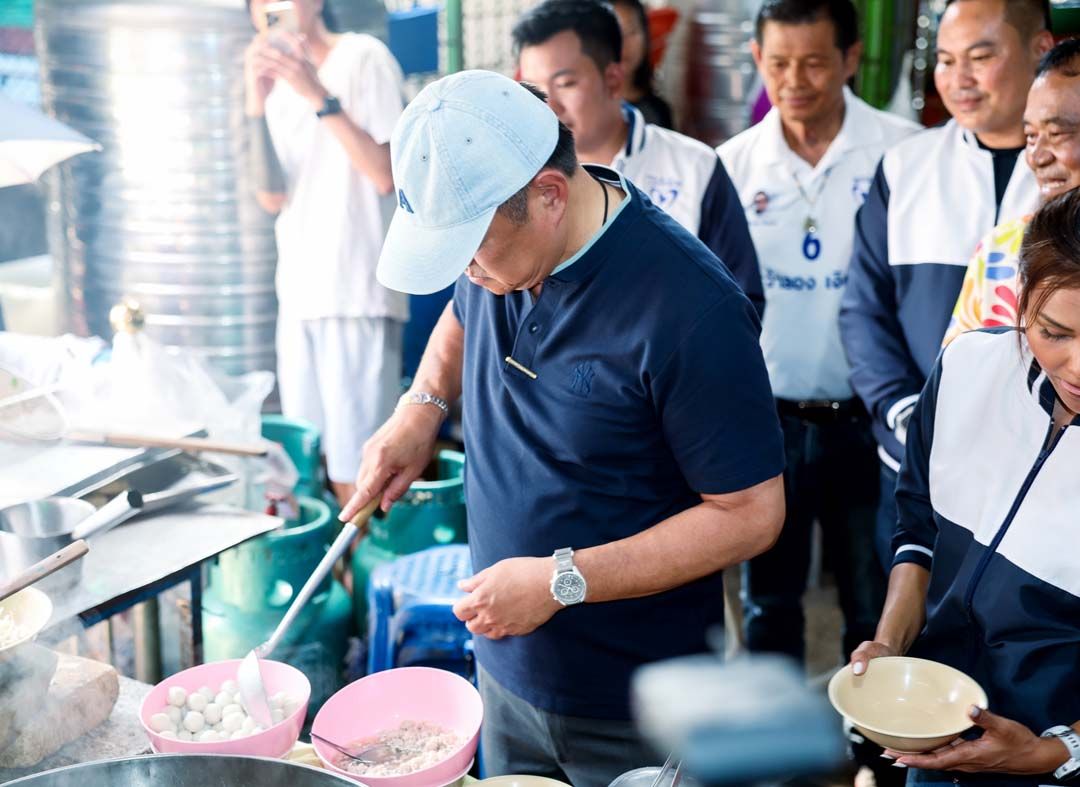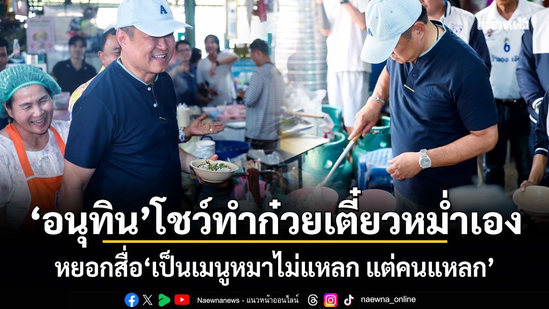 จากนั้น นายอนุทินได้ไปที่ร้านก๋วยเตี๋ยวชื่อดัง พร้อมกับลวกเส้น ปรุงอาหารด้วยตัวเอง พร้อมหันมาหยอกกับผู้สื่อข่าวว่า "เป็นเมนูหมาไม่แหลก แต่คนแหลก" แล้วเดินไปนั่งรับประทานที่โต๊ะอาหาร ร่วมกับผู้สมัคร สส.และแกนนำพรรค ภายหลังจากรับประทานอิ่มแล้วได้เดินไปที่แพปลา บริเวณท่าน้ำวัดศาลเจ้า เพื่อให้อาหารปลา