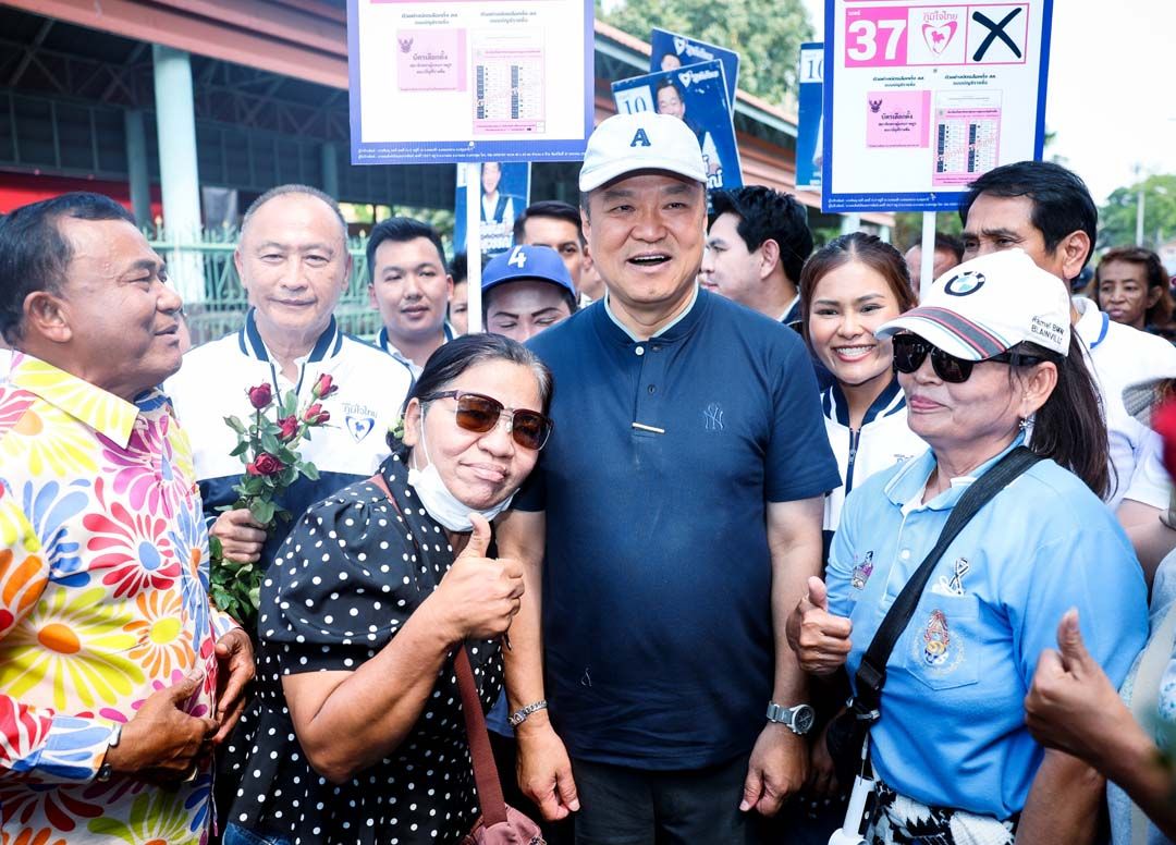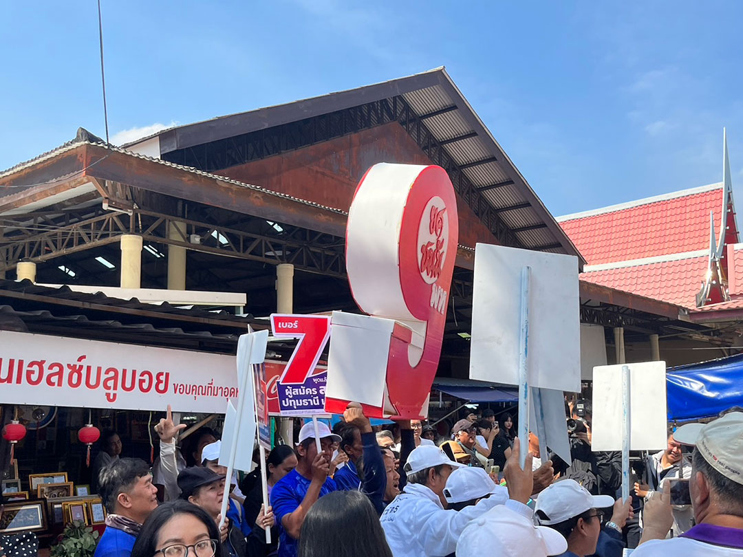 ขณะที่บรรยากาศด้านนอกศาลา ระหว่างนายอนุทินไหว้เซียนแปะโรงสีอยู่ในศาลา ปรากฏว่ามีชาย 1 ราย ที่สนับสนุนพรรคเพื่อไทย (พท.) ได้นำม็อกอัพหมายเลข 9 ซึ่งเขียนว่า ยศชนัน (วงศ์สวัสดิ์) แคนดิเดตนายกฯ พรรคเพื่อไทย มาตะโกนแข่งกันกองเชียร์ของพรรคภูมิใจไทย ว่า "เบอร์ 9" พร้อมกับระบุว่า "ตนเป็นหัวคะแนนธรรมชาติ ไม่ได้มีใครจ้างมา ไม่ได้มาป่วน แต่ต้องการให้นายชาญเห็นว่า ประชาชนเลือกเพื่อไทยแล้วสุดท้ายก็ทรยศประชาชนส่งลูกสาวมาลงกับพรรคภูมิใจไทย ถ้าตนเป็นนายกฯ ไม่เอาคนแบบนี้ลง" อย่างไรก็ตาม ชายรายดังกล่าวได้เดินตามประกบคณะของนายอนุทินตลอดการลงพื้นที่