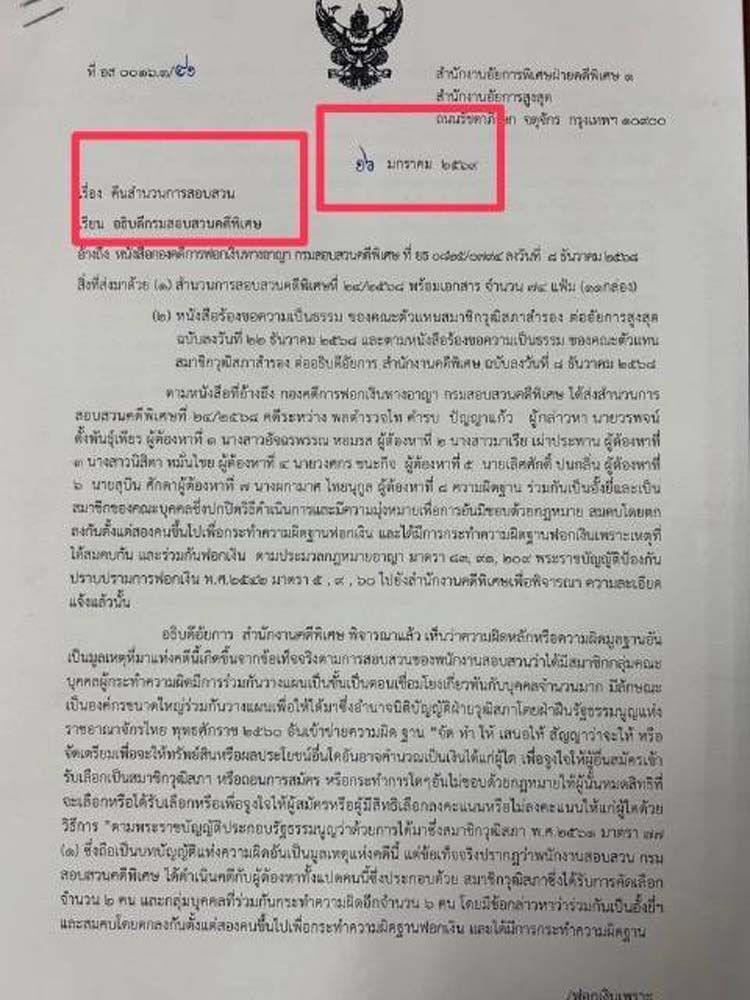 เมื่อวันที่ 28 มกราคม 2569 ผู้สื่อข่าวได้รับรายงานเกี่ยวกับเอกสารจากสำนักงานอัยการพิเศษ ฝ่ายคดีพิเศษ 1 สำนักงานอัยการสูงสุด ซึ่งได้มีหนังสือส่งถึงอธิบดีกรมสอบสวนคดีพิเศษ เมื่อวันที่ 16 ม.ค.69 เรื่อง คืนสำนวนการสอบสวน โดยอ้างถึงหนังสือกองคดีการฟอกเงินทางอาญา กรมสอบสวนคดีพิเศษ ที่ ยธ.0825/0794 ลงวันที่ 8 ธ.ค.68 พร้อมเอกสารที่ส่งแนบมาด้วย (1) สำนวนการสอบสวนคดีพิเศษที่ 24/2568 พร้อมเอกสารจำนวน 74 แฟ้ม (2) หนังสือร้องขอความเป็นธรรมของคณะตัวแทนสมาชิกวุฒิสภาสำรอง ต่ออัยการสูงสุด ฉบับลงวันที่ 22 ธ.ค.68 และตามหนังสือร้องขอความเป็นธรรม ของคณะตัวแทนสมาชิกวุฒิสภาสำรอง ต่ออธิบดีอัยการ สำนักงานคดีพิเศษ ฉบับลงวันที่ 8 ธ.ค.68