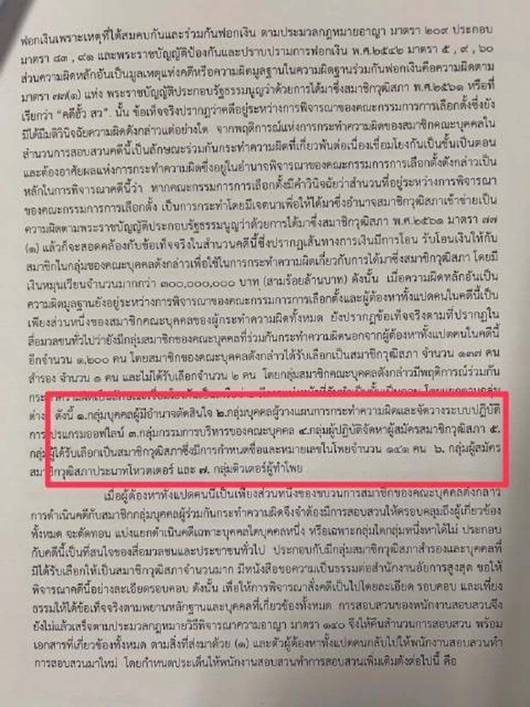 2.) ให้พนักงานสอบสวนนำพยานหลักฐานทั้งหมดทั้งพยานบุคคล พยานเอกสาร และพยานวัตถุ อันเป็นพยานหลักฐานสำคัญแห่งคดีในสำนวนการไต่สวนของคณะกรรมการการเลือกตั้ง ในความผิดที่มีการกล่าวหาสมาชิกของคณะบุคคลที่มีการกระทำเพื่อให้ได้ได้มาซึ่งอำนาจนิติ บัญญัติฝ่ายวุฒิสภาโดยฝ่าฝืนรัฐธรรมนูญแห่งราชอาณาจักรไทย พ.ศ.2560 อันเข้าข่ายความผิดฐาน จัด ทำ ให้ เสนอให้ สัญญาว่าจะให้ หรือจัดเตรียมเพื่อจะให้ทรัพย์สินหรือผลประโยชน์อื่นใดอันอาจคำนวณเป็นเงินได้แก่ผู้ใด เพื่อจูงใจให้ผู้อื่นสมัครเข้ารับเลือกเป็นสมาชิกวุฒิสภา หรือถอนการสมัคร หรือกระทำการใดๆ อันชอบด้วยกฎหมายให้ผู้นั้นหมดสิทธิที่จะเลือกหรือได้รับเลือกหรือเพื่อจูงใจให้ผู้สมัครหรือผู้มีสิทธิ์เลือกลงคะแนนหรือไม่ลงคะแนนให้แก่ผู้ใดด้วยวิธีการ ตามพระราชบัญญัติประกอบรัฐธรรมนูญว่าด้วยการได้มาซึ่งสมาชิกวุฒิสภา พ.ศ.2561 มาตรา 77 (1) อันเป็นความผิดที่เป็นมูลฐานแห่งการดำเนินคดีนี้ประกอบกับความผิดของสมาชิกคณะบุคคลกลุ่มเครือข่ายผู้ร่วมกระทำความผิด มาประกอบสำนวนการสอบสวนด้วย