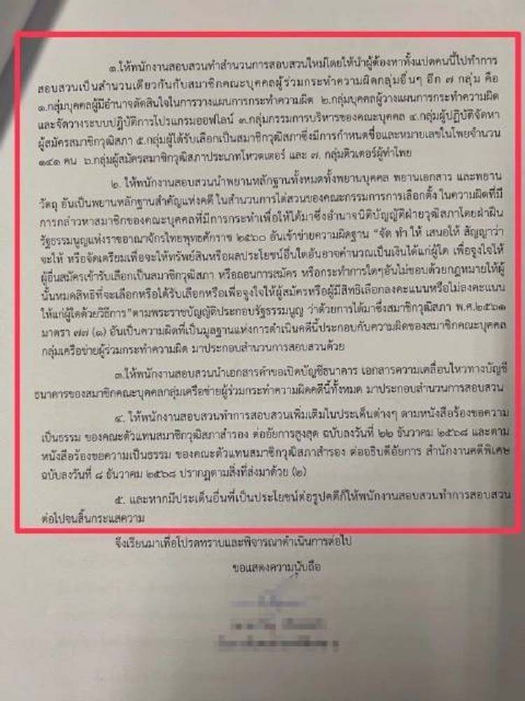 4.) ให้พนักงานสอบสวนทำการสอบสวนเพิ่มเติมในประเด็นต่างๆ ตามหนังสือร้องขอความเป็นธรรมของคณะตัวแทนสมาชิกวุฒิสภาสำรองต่ออัยการสูงสุด ฉบับลงวันที่ 22 ธ.ค.68 และตามหนังสือร้องขอความเป็นธรรมของคณะตัวแทนสมาชิกวุฒิสภาสำรองต่ออธิบดีอัยการ สำนักงานคดีพิเศษ ฉบับลงวันที่ 8 ธ.ค.68