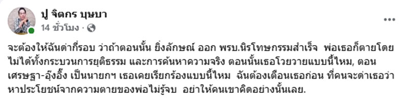 ล่าสุด "ปู" จิตกร บุษบา สื่อมวลชนและพิธีกรช่อง แนวหน้าออนไลน์ โพสต์ข้อความตอบโต้เกี่ยวกับเรื่อง ผ่านเฟซบุ๊ก ระบุว่า จะต้องให้ฉันด่ากี่รอบ ว่าถ้าตอนนั้น ยิ่งลักษณ์ ออก พรบ.นิรโทษกรรมสำเร็จ พ่อเธอก็ตายโดยไม่ได้ทั้งกระบวนการยุติธรรม และการค้นหาความจริง ตอนนั้นเธอโวยวายแบบนี้ไหม, ตอน เศรษฐา-อุ๊งอิ๊ง เป็นนายกฯ เธอเคยเรียกร้องแบบนี้ไหม ฉันต้องเตือนเธอก่อน ที่คนจะด่าเธอว่า หาประโยชน์จากความตายของพ่อไม่รู้จบ อย่าให้คนเขาคิดอย่างนั้นเลย