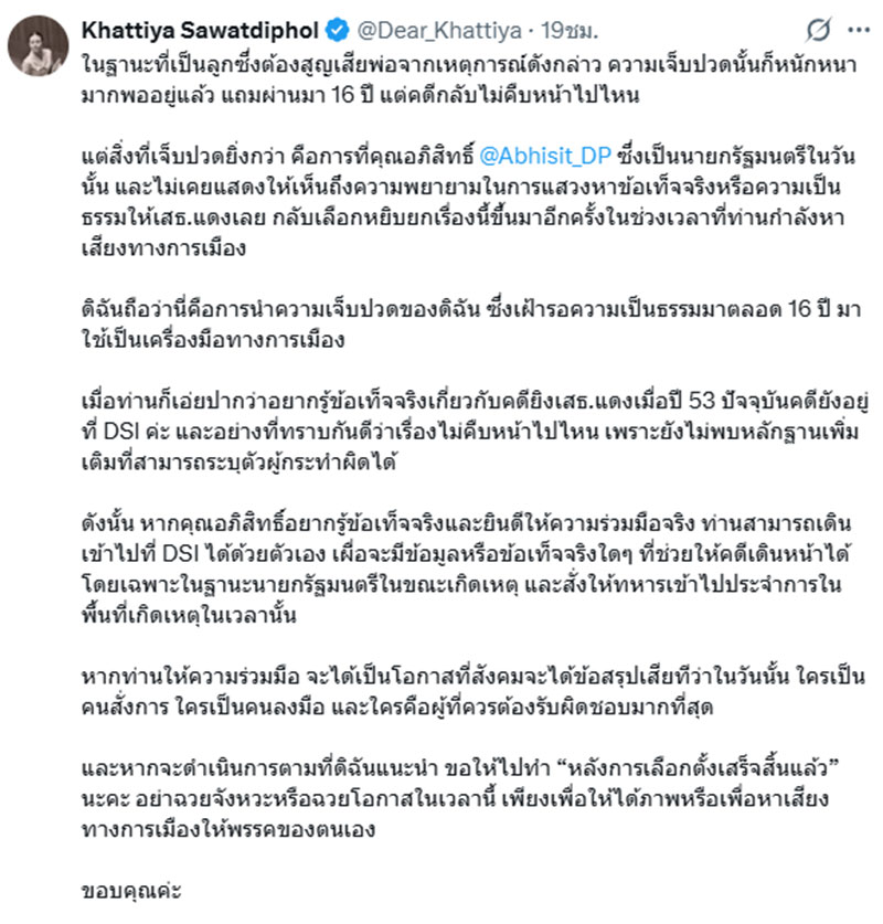 วันที่ 29 มกราคม 2569 จากกรณี น.ส.ขัตติยา สวัสดิผล ผู้สมัคร สส.บัญชีรายชื่อ พรรคเพื่อไทย โพสต์ข้อความ เกี่ยวกับคดี คดี 'เสธ.แดง' 16 ปีไม่คืบหน้า โดยบอกว่า สิ่งที่เจ็บปวดยิ่งกว่า คือการที่คุณอภิสิทธิ์ @Abhisit_DP ซึ่งเป็นนายกรัฐมนตรีในวันนั้น และไม่เคยแสดงให้เห็นถึงความพยายามในการแสวงหาข้อเท็จจริง หรือความเป็นธรรมให้เสธ.แดงเลย กลับเลือกหยิบยกเรื่องนี้ขึ้นมาอีกครั้งในช่วงเวลาที่ท่านกำลังหาเสียงทางการเมือง ดิฉันถือว่านี่คือการนำความเจ็บปวดของดิฉัน ซึ่งเฝ้ารอความเป็นธรรมมาตลอด 16 ปี มาใช้เป็นเครื่องมือทางการเมือง