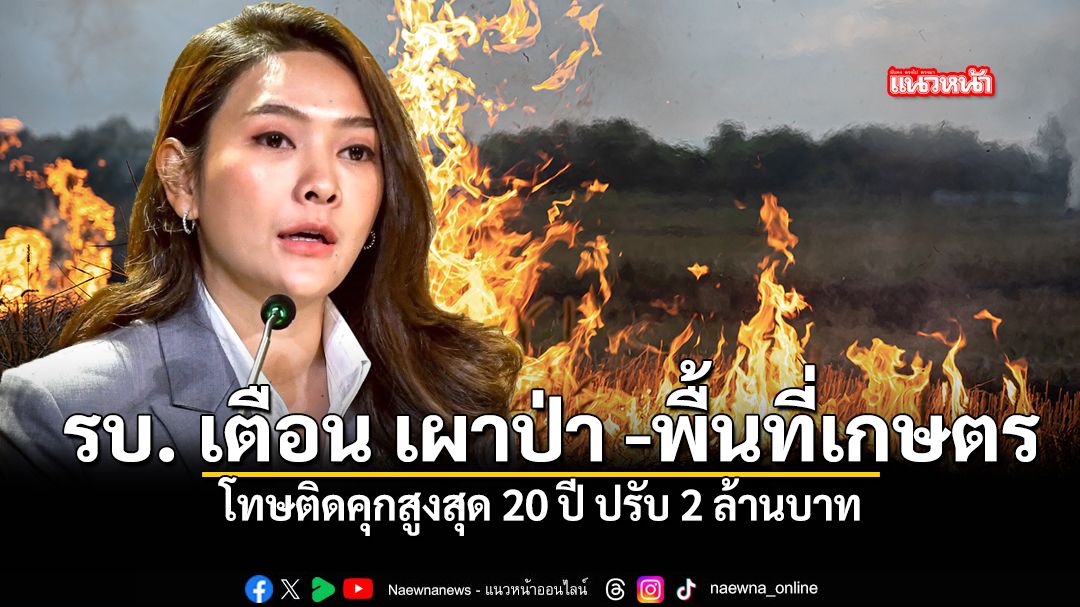 - การเผาในพื้นที่เกษตรกรรม เช่น เผาไร่อ้อย เผาตอซังข้าว หรือเผาในที่โล่ง จนน่าจะเป็นอันตรายต่อผู้อื่นและทรัพย์ของผู้อื่น มีความผิดตามประมวลกฎหมายอาญา มาตรา 220 ต้องระวางโทษจำคุกไม่เกิน 7 ปี และปรับไม่เกิน 140,000 บาท หรือทั้งจำทั้งปรับ
