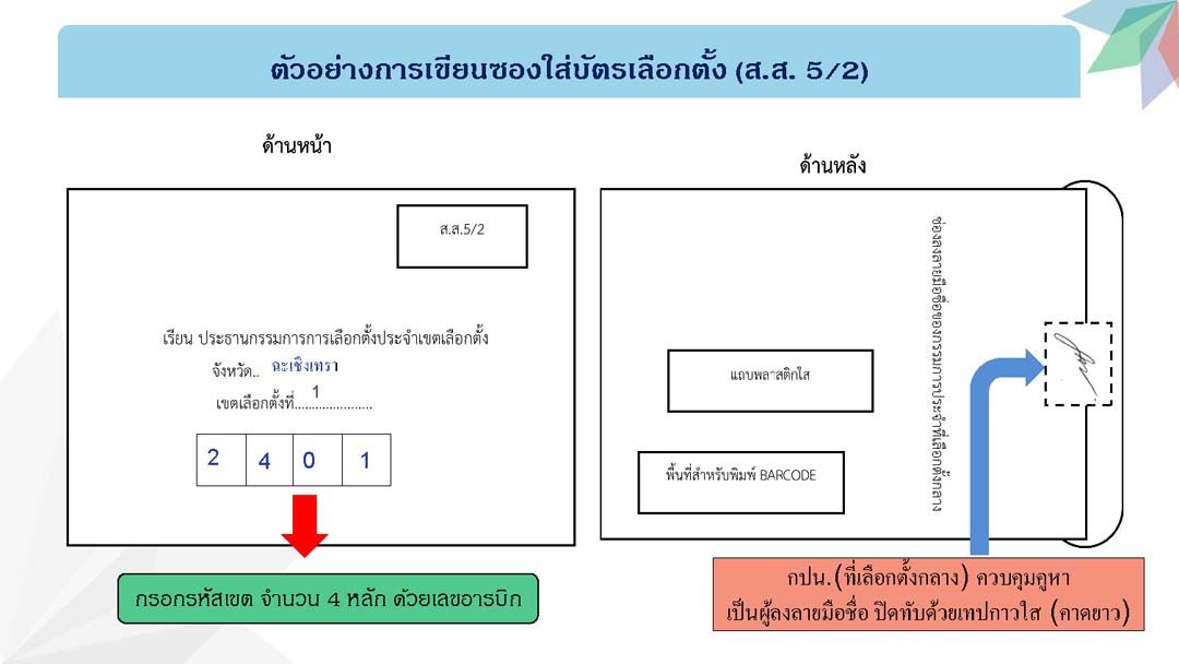 สำหรับซองบัตรเลือกตั้ง (ส.ส.5/2) ประกอบด้วย ข้อมูลโดยด้านหน้าซองใส่บัตรเลือกตั้ง จะเป็นข้อมูลชื่อจังหวัด เขตเลือกตั้ง และช่องว่าง 4 ช่อง ให้กรอกรหัสเขตเลือกตั้ง 4 หลัก โดยสามารถดูรหัสเขตเลือกตั้งได้จากบัญชีรายชื่อผู้มีสิทธิเลือกตั้ง ส่วนด้านหลังของซองใส่บัตรเลือกตั้ง จะประกอบไปด้วยข้อมูล ช่องให้ลงลายมือชื่อของ กปน.ที่เลือกตั้งกลางที่ควบคุมคูหานั้นๆ เป็นผู้ลงลายมือชื่อปิดทับด้วยแพรแถบกาว และมีแถบพลาสติกใสและพื้นที่สำหรับบาร์โค้ด