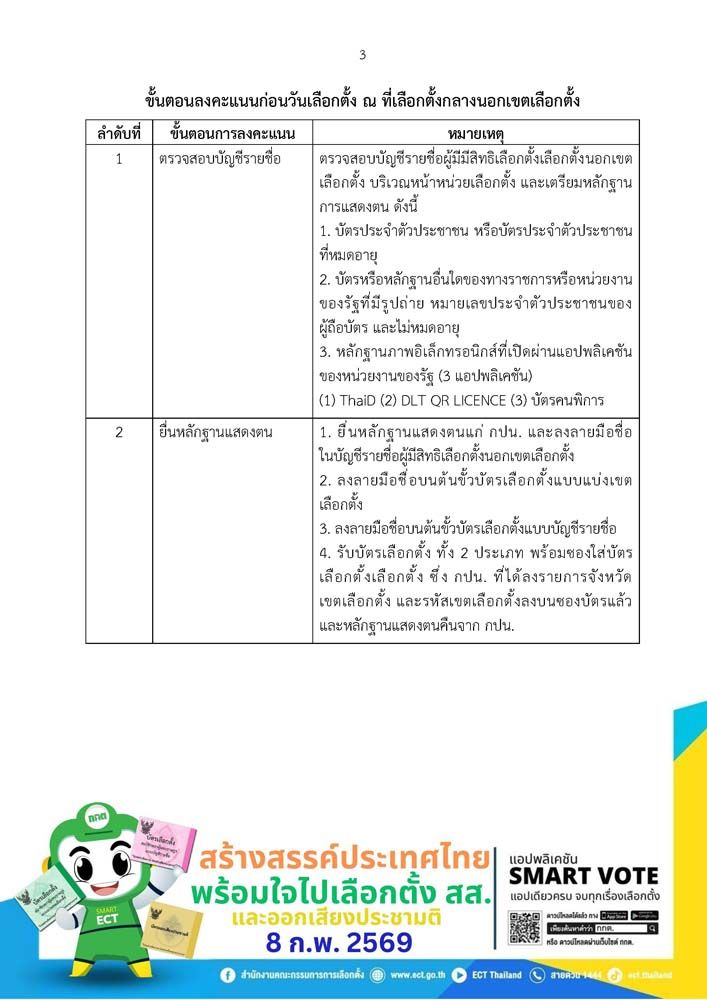 เมื่อวันที่ 29 มกราคม 2569 สำนักงานคณะกรรมการการเลือกตั้ง (กกต.) ประชาสัมพันธ์ตัวอย่างซองใส่บัตรเลือกตั้ง (ส.ส.5/2) ที่จะใช้ในการลงคะแนนเลือกตั้ง สส.ล่วงหน้า นอกเขตเลือกตั้ง เมื่อผู้มีสิทธิเลือกตั้งเข้าไปแสดงตนในหน่วยกับกรรมการประจำที่เลือกตั้งกลาง หรือ กปน.ที่เลือกตั้งกลาง โดยจะได้รับบัตรเลือกตั้งแบบแบ่งเขตและแบบบัญชีรายชื่อ และซองใส่บัตรเลือกตั้ง โดย กปน.ที่เลือกตั้งกลางจะเป็นผู้เขียนชื่อจังหวัด เขตเลือกตั้ง และรหัสเลือกตั้งลงบนซองใส่บัตรเลือกตั้ง ก่อนส่งมอบบัตรเลือกตั้ง ซองใส่บัตรเลือกตั้ง พร้อมด้วยหลักฐานแสดงตนคืนให้กับผู้มีสิทธิเลือกตั้ง เพื่อไปลงคะแนนในคูหาเลือกตั้ง พร้อมเน้นย้ำผู้มีสิทธิเลือกตั้งให้ตรวจสอบข้อมูลที่อยู่บนหน้าซองใส่บัตรเลือกตั้งให้ถูกตัองครบถ้วนทั้งชื่อจังหวัด เขตเลือกตั้งและรหัสเลือกตั้ง ซึ่งเป็นตัวเลข 4 หลัก ถ้าข้อมูลไม่ถูกต้องให้แจ้ง กปน.ที่เลือกตั้งกลาง ดำเนินการแก้ไขให้ถูกต้อง เพื่อให้ซองที่ใส่บัตรเลือกตั้งสามารถส่งกลับไปยังเขตเลือกตั้งของผู้มีสิทธิเลือกตั้งได้อย่างถูกต้อง ขณะที่การลงคะแนนเลือกตั้ง สส.ล่วงหน้าในเขตเลือกตั้ง จะไม่ได้รับซองใส่บัตรเลือกตั้ง