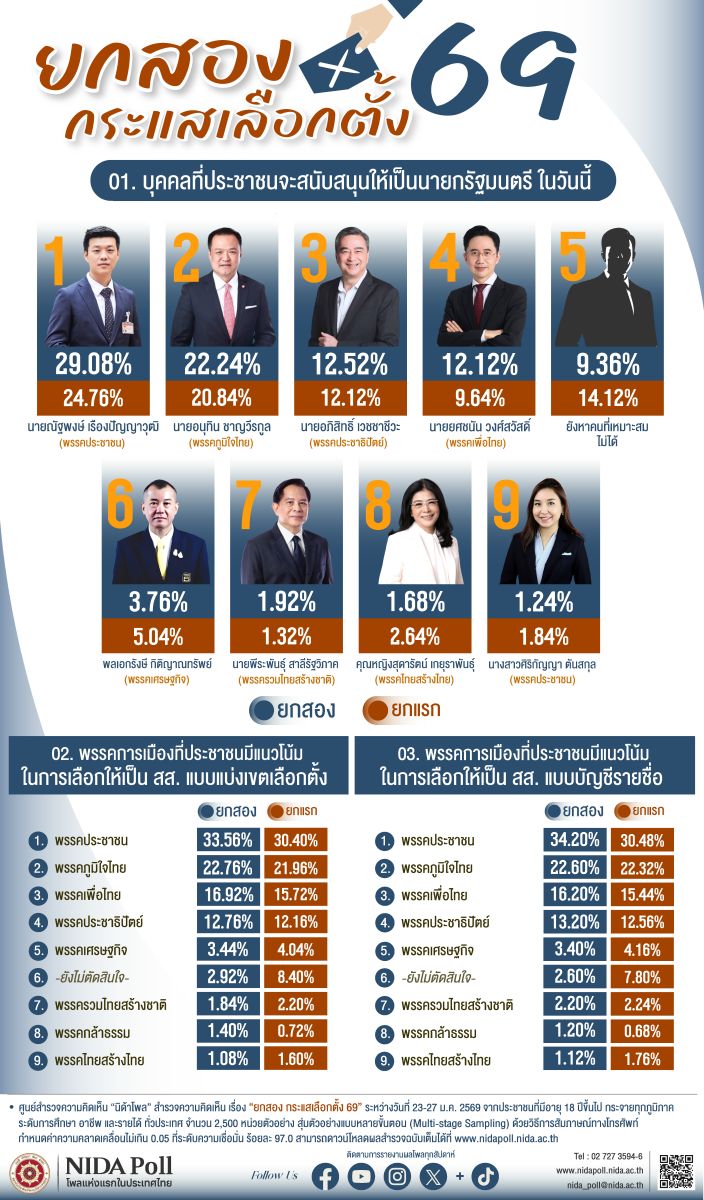 ศูนย์สำรวจความคิดเห็น “นิด้าโพล” สถาบันบัณฑิตพัฒนบริหารศาสตร์ (นิด้า) เปิดเผยผลการสำรวจ เรื่อง “ยกสอง กระแสเลือกตั้ง 69” ทำการสำรวจระหว่างวันที่ 23-27 มกราคม 2569 จากประชาชนที่มีอายุ 18 ปีขึ้นไป กระจายทุกภูมิภาค ระดับการศึกษา อาชีพ และรายได้ ทั่วประเทศ รวมจำนวนทั้งสิ้น 2,500 หน่วยตัวอย่าง เกี่ยวกับกระแสการเลือกตั้ง ปี 2569 การสำรวจอาศัยการสุ่มตัวอย่างโดยใช้ความน่าจะเป็นจากบัญชีรายชื่อฐานข้อมูลตัวอย่างหลัก (Master Sample) ของ “นิด้าโพล” สุ่มตัวอย่างแบบหลายขั้นตอน (Multi-stage Sampling) เก็บข้อมูลด้วยวิธีการสัมภาษณ์ทางโทรศัพท์ โดยกำหนดค่าความคลาดเคลื่อนไม่เกิน 0.05 ที่ระดับความเชื่อมั่น ร้อยละ 97.0