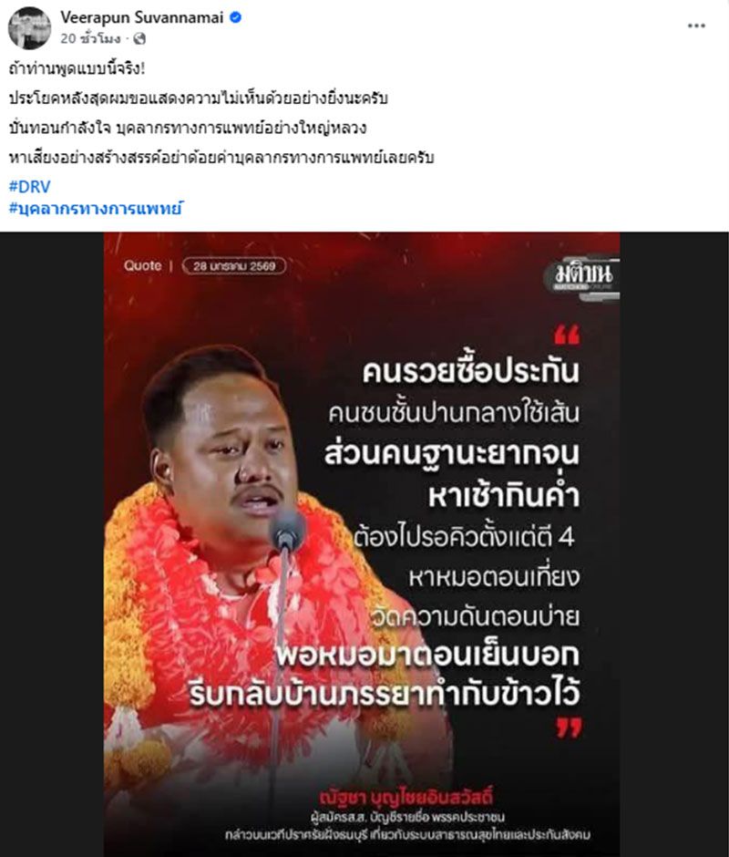 วันที่ 30 มกราคม 2569 นพ.วีระพันธ์ สุวรรณนามัย สมาชิกวุฒิสภา (สว.) ได้แชร์ภาพของ นายณัฐชา บุญไชยอินสวัสดิ์ ผู้สมัครส.ส.บัญชีรายชื่อ พรรคประชาชน ที่กล่าวบนเวทีปราศัยฝั่งธนบุรี เกี่ยวกับระบบสาธารณสุขไทยและประกันสังคม ว่า "คนรวยซื้อประกัน คนชั้นกลางใช้เส้น ส่วนคนฐานะยากจน หาเช้ากินค่ำ ต้องไปรอคิวตั้งแต่ตี 4 หาหมอตอนเที่ยง วัดความดันตอนบ่าย พอหมอมาตอนเย็นบอก รีบกลับบ้านภรรยาทำกับข้าวไว้"