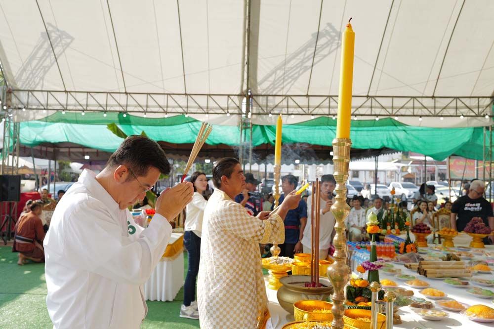 จากนั้นได้เข้าสู่ช่วงพิธีการบวงสรวง โดยนายชัยวุฒิ ธนาคมานุสรณ์ หัวหน้าพรรครักชาติ ได้จุดเทียนมงคล พร้อม ขอขมากรรม ท่ามกลางบรรยากาศที่เต็มไปด้วยความศรัทธาและความสงบ ซึ่งคณะพรรครักชาติได้เข้าร่วมในพิธีจุดบายศรีสักการะหลวงปู่ธรรมโชติและวีรชนค่ายบางระจัน เพื่อแสดงถึงความกตัญญูกตเวทีต่อบรรพบุรุษ พร้อมกันนี้ยังมีการจุดเทียน โดยประชาชนชาวบางระจัน เพื่อสักการะ สระน้ำศักดิ์สิทธิ์ ในวัดโพธิ์เก้าต้นด้วย