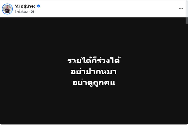 วันที่ 30 มกราคม 2568 นายวัน อยู่บำรุง อดีต สส. กทม. ได้โพสต์ข้อความผ่านเฟซบุ๊ก "วัน อยู่บำรุง" ระบุสั้นๆว่า "รวยได้ก็ร่วงได้ อย่าปากหมา อย่าดูถูกคน"
