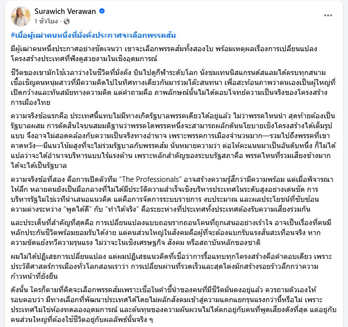 ผมไม่ได้ปฏิเสธการเปลี่ยนแปลง แต่ผมปฏิเสธแนวคิดที่เชื่อว่าการรื้อแทบทุกโครงสร้างคือคำตอบเดียว เพราะประวัติศาสตร์การเมืองทั่วโลกสอนเราว่า การเปลี่ยนผ่านที่รวดเร็วและสุดโต่งมักสร้างรอยร้าวลึกกว่าความก้าวหน้าที่ยั่งยืน