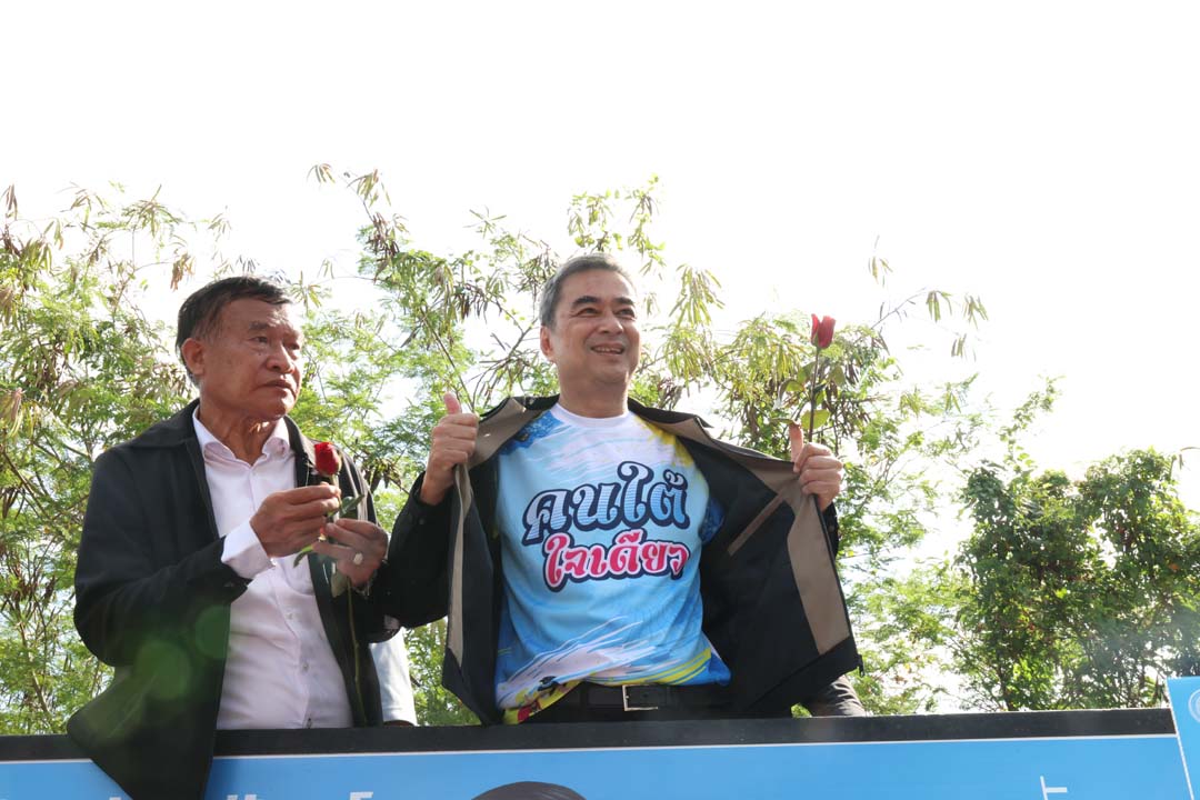 นายอภิสิทธิ์ กล่าวในช่วงท้ายว่า เขาพูดกันว่าคนใต้รักพรรคประชาธิปัตย์ พรรคอื่นที่มาหาเสียงก็จะมาขอแบ่ง แต่คนใต้ใจเดียว ให้เลือกประชาธิปัตย์ 2 ใบ เพราะอาทิตย์หน้าทุนเทาจะแปลงร่างเป็นแบงก์เทา และเริ่มมีการจดชื่อแล้ว พร้อมถามชาวบ้าน เอาไหมเอา ซึ่งชาวบ้านตะโกนว่าเอา นายอภิสิทธิ์ จึงกล่าวกับชาวบ้านว่าเอาได้แต่ไม่เลือก แน่ใจหรือไม่ ถ้าไม่เลือก ตนจะได้กลับมาเยี่ยมเยียน ผู้แทนฯ กลับมาดูแลพี่น้อง ทำให้บ้านเมืองสุจริต เศรษฐกิจดีขึ้น และไทยหายจน