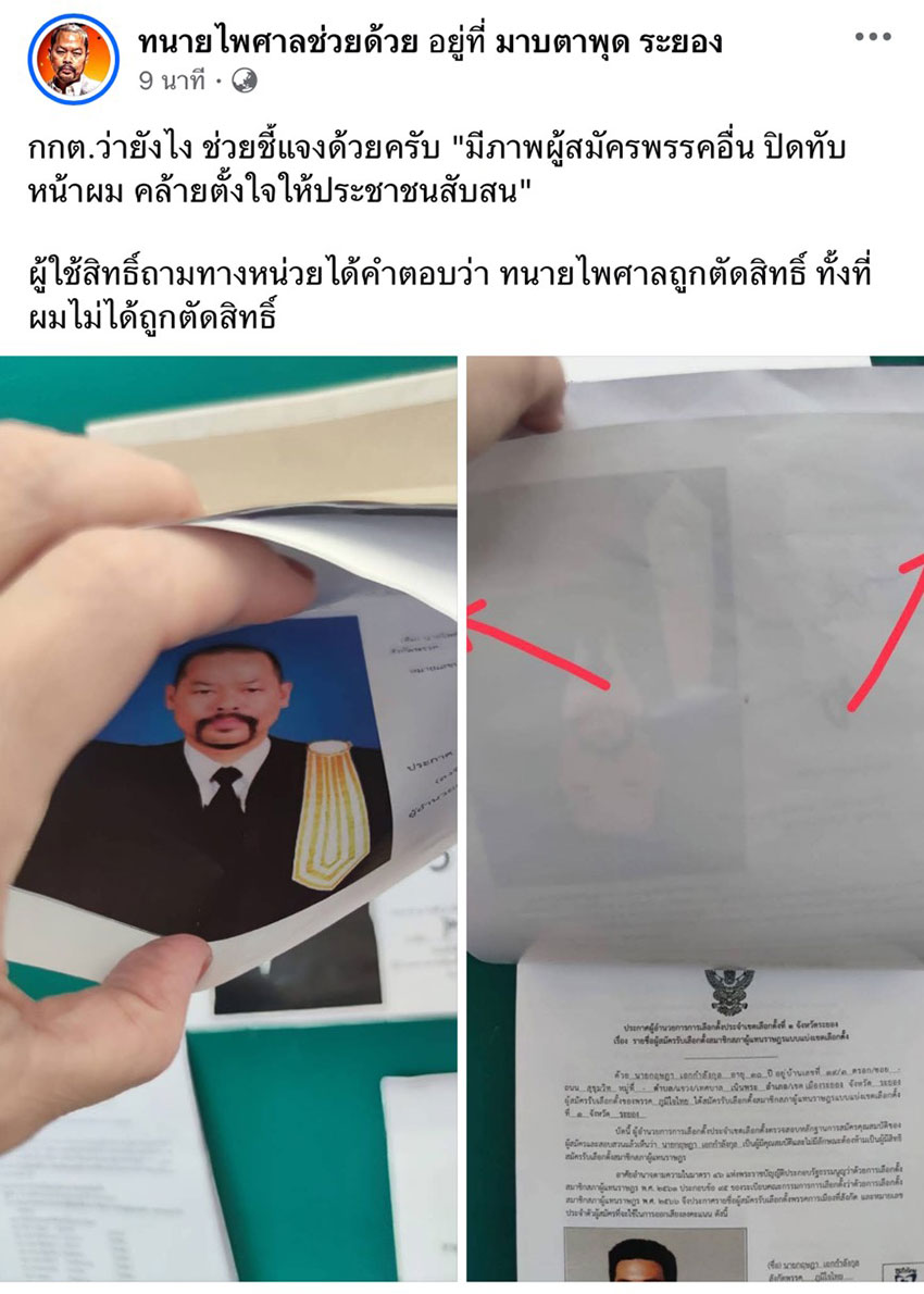 เป็นงง!! “ทนายไพศาล” เดือด โพสต์จี้ กกต. หลังชื่อ หายจากบอร์ดรายชื่อผู้สมัคร เขต 1 ระยอง พบใช้แม็กเย็บติดหน้าผู้สมัครพรรคอื่นทับ ลั่น ไม่เคยถูกตัดสิทธิ์ ! โวย จทน.หน้าหน่วยทำประชาชนสับสน