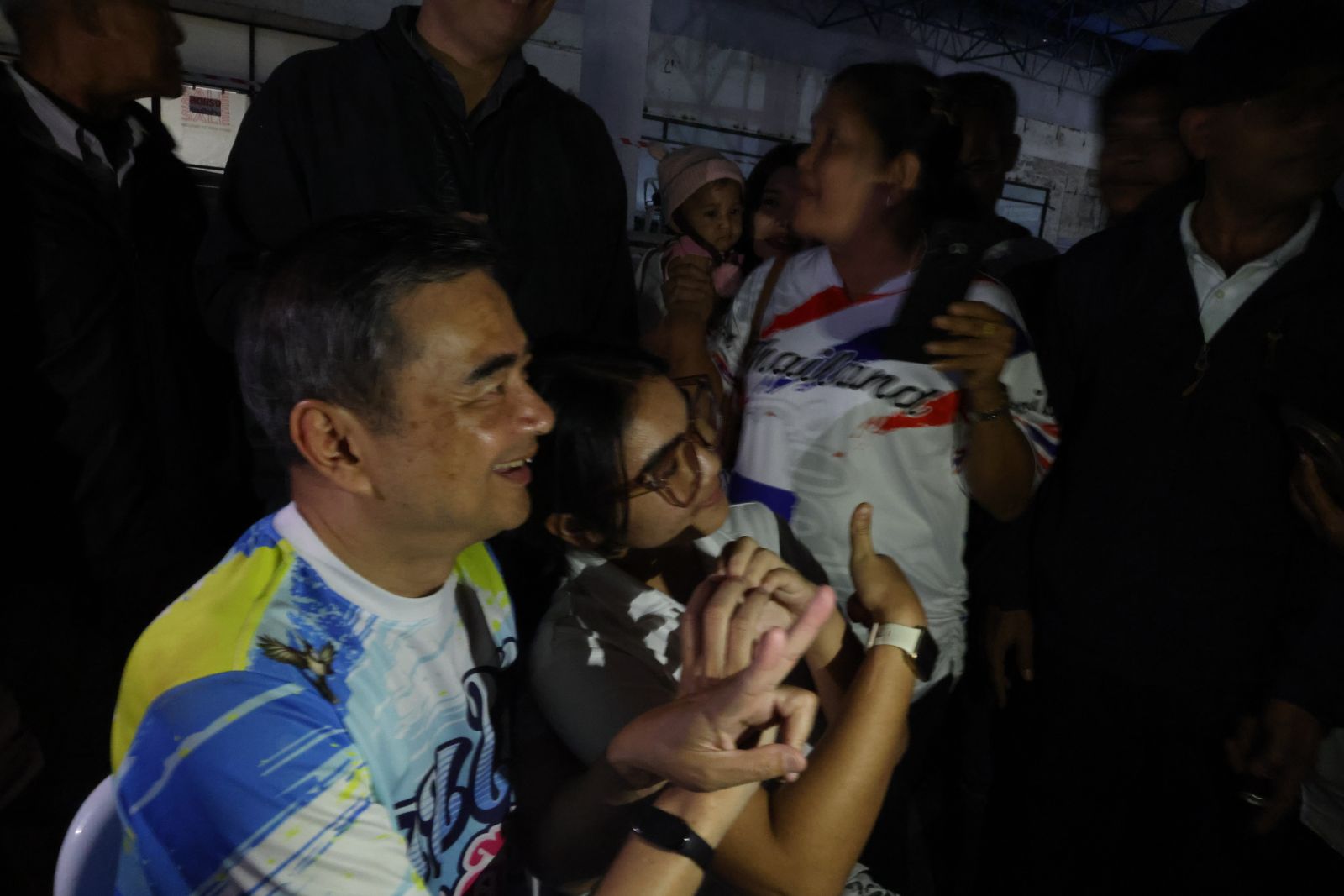 จากนั้นนายอภิสิทธิ์ถามว่า “พี่น้องนครศรีธรรมราชกลับมาแล้วใช่ไหม นครศรี สีอะไร” ประชาชนที่นั่งฟังบอกว่า “สีฟ้า”