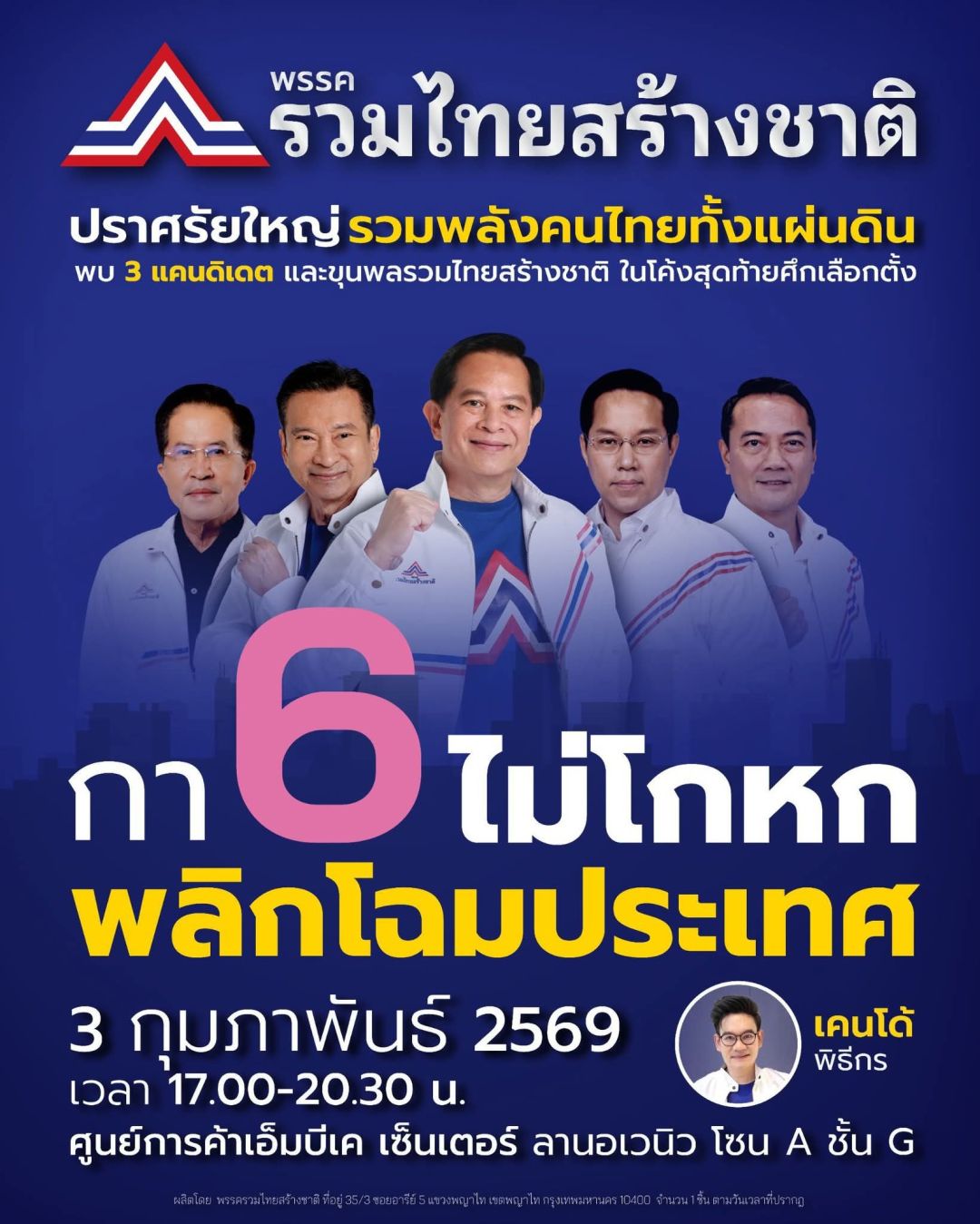 เมื่อวันที่ 2 ก.พ.2569 พรรครวมไทยสร้างชาติ เตรียมสร้างปรากฏการณ์ครั้งสำคัญในช่วงโค้งสุดท้ายก่อนการตัดสินอนาคตประเทศ ขอเชิญชวนพี่น้องประชาชนคนไทย ร่วมเป็นส่วนหนึ่งของหน้าประวัติศาสตร์ ในงานปราศรัยใหญ่ที่เข้มข้นที่สุดแห่งปี “กา 6 ไม่โกหก พลิกโฉมประเทศ” เพื่อแสดงพลังความพร้อมและย้ำจุดยืนในการนำพาประเทศก้าวข้ามทุกวิกฤตอย่างยั่งยืน ในวันอังคารที่ 3 ก.พ.2569 ตั้งแต่เวลา 17.00 น. เป็นต้นไป ณ ลานอเวนิว โซน A ชั้น G ศูนย์การค้าเอ็มบีเค เซ็นเตอร์ (มาบุญครอง) ฝั่งถนนพระราม 1