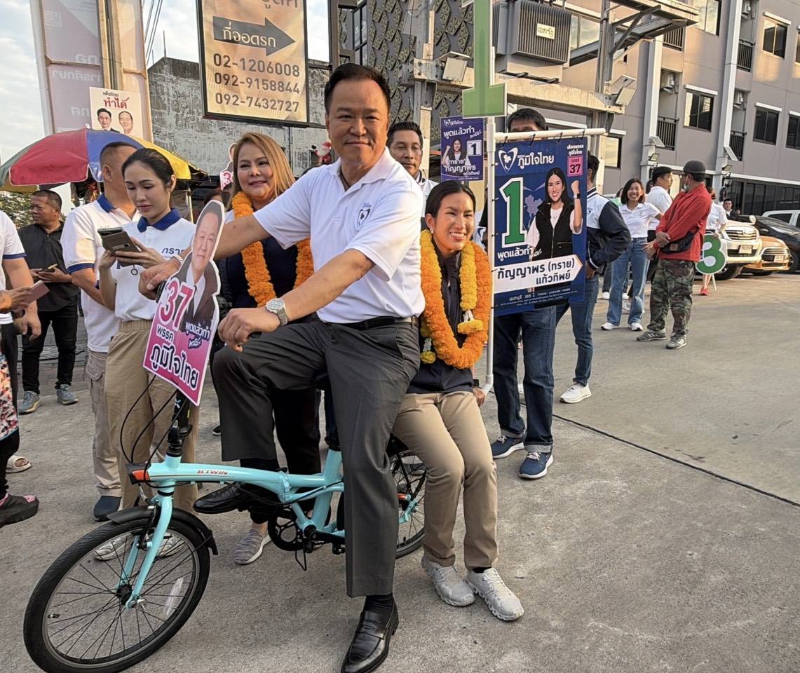 เมื่อเวลา 06.30 น. วันที่ 3 ก.พ.2569 ที่ จ.นนทบุรี นายอนุทิน ชาญวีรกูล หัวหน้า และแคนดิเดตนายกรัฐมในตรี พรรคภูมิใจไทย ลงพื้นที่หาเสียงตลาดนัดเช้าพระนั่งเกล้า เพื่อช่วยน.ส.กัญญาพร แก้วทิพย์ ผู้สมัคร สส.นนทบุรี เขต 1 พรรคภูมิใจไทยหาเสียง โดยมีผู้สมัคร สส.นนทบุรี ประกอบด้วย นายเฉลิมพล นิยมสินธุ์ ผู้สมัครสส.เขต 2 น.ส. สิริภิญญ์ อินทรประเสริฐ ผู้สมัครสส.เขต 3 และนายอดุล จันทร์แก้ว ผู้สมัครสส.เขต 8 พรรคภูมิใจไทย ร่วมลงพื้นที่หาเสียงด้วย