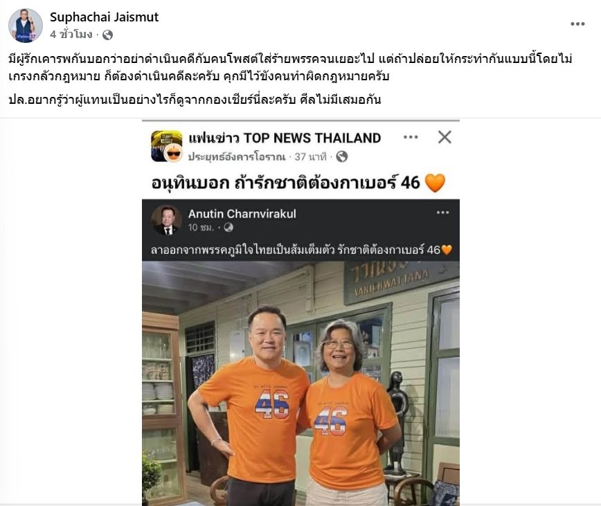เมื่อวันที่ 3 ก.พ.2569 นายศุภชัย ใจสมุทร ผู้สมัคร สส.บัญชีรายชื่อ และประธานคณะทำงานด้านกฎหมาย พรรคภูมิใจไทย โพสต์เฟซบุ๊ก โดยนำภาพจากเพจหนึ่งที่มีการตัดต่อเพจ และภาพของนายอนุทิน ชาญวีรกูล หัวหน้าพรรคภูมิใจไทย ยืนคู่กับผู้หญิงใส่เสื้อสีส้ม ด้านหน้ามีหมายเลข 46 ซึ่งเป็นเบอร์ของพรรคประชาชน พร้อมระบุข้อความลาออกจากพรรคภูมิใจไทยเป็นส้มเต็มตัว รักชาติต้องกาเบอร์ 46 ว่า "มีผู้ที่รักเคารพกันบอกว่าอย่าดำเนินคดีกับคนโพสต์ใส่ร้ายพรรคจนเยอะไป แต่ถ้าปล่อยให้กระทำกันแบบนี้โดยไม่เกรงกลัวกฎหมาย ก็ต้องดำเนินคดีกัน คุกมีไว้ขังคนทำผิดกฎหมายครับ ปล.อยากรู้ว่าผู้แทนเป็นอย่างไรก็ดูจากกองเชียร์นี่ละครับ ศีลไม่มีเสมอกัน"
