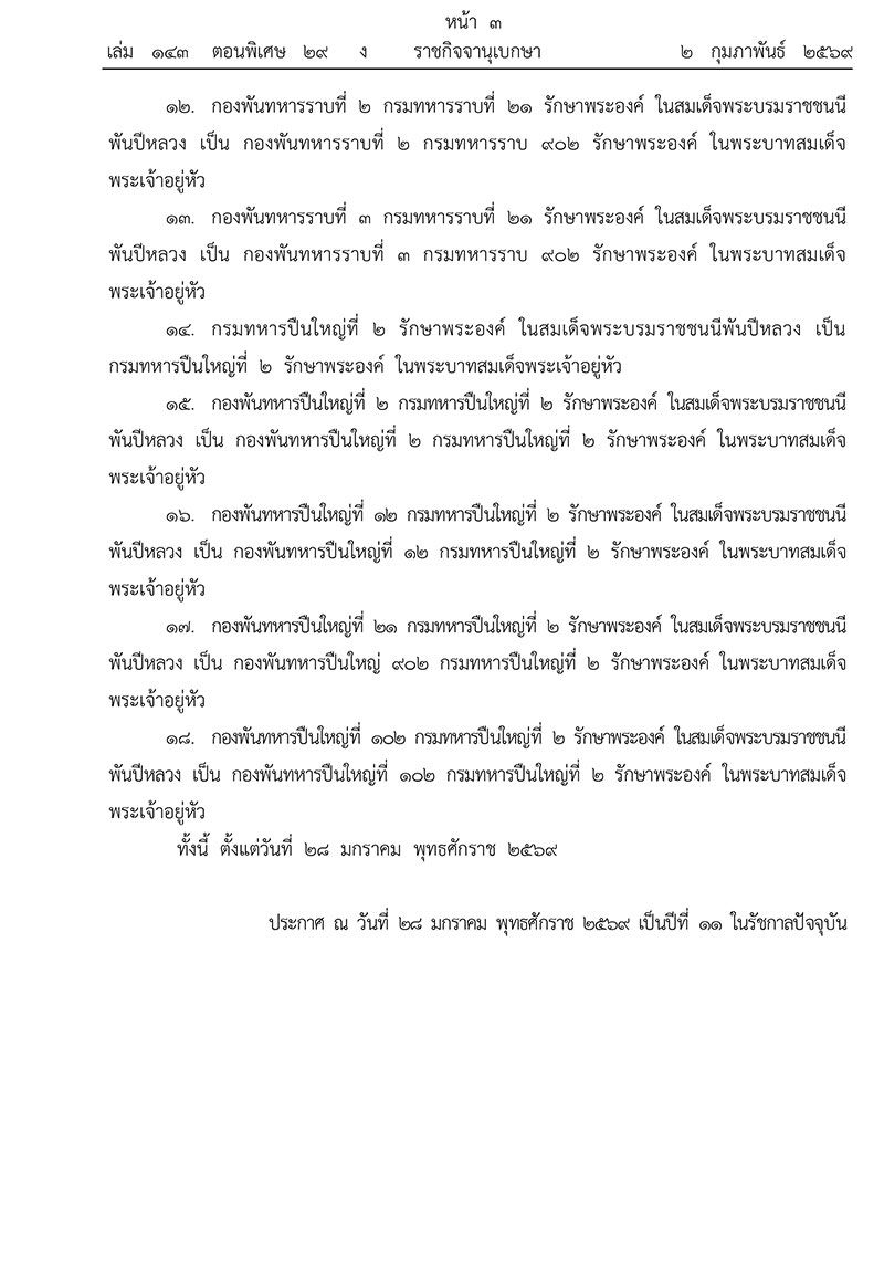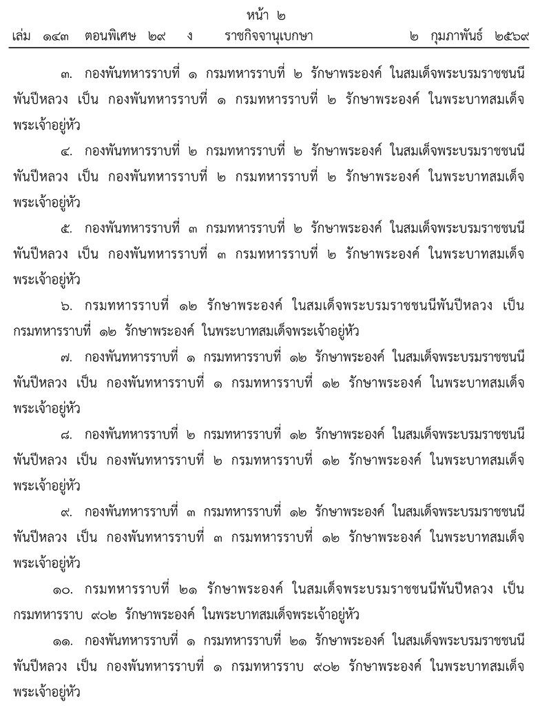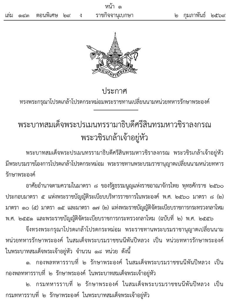 เว็บไซด์ราชกิจจานุเบกษา เผยแพร่ประกาศ โปรดเกล้าฯ พระราชทานเปลี่ยนนาม หน่วยทหารรักษาพระองค์ จาก “ในสมเด็จพระบรมราชชนนีพันปีหลวง” เป็น “ในพระบาทสมเด็จพระเจ้าอยู่หัว” รวม 18 หน่วย