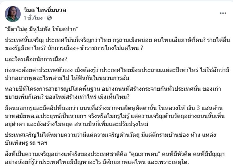 วันที่ 3 กุมภาพันธ์ 2569 วิมล ไทรนิ่มนวล นักเขียนรางวัลซีไรต์ โพสต์ข้อความผ่านเฟซบุ๊ก ระบุว่า "มีตาไม่ดู มีหูไม่ฟัง ใช้แต่ปาก"