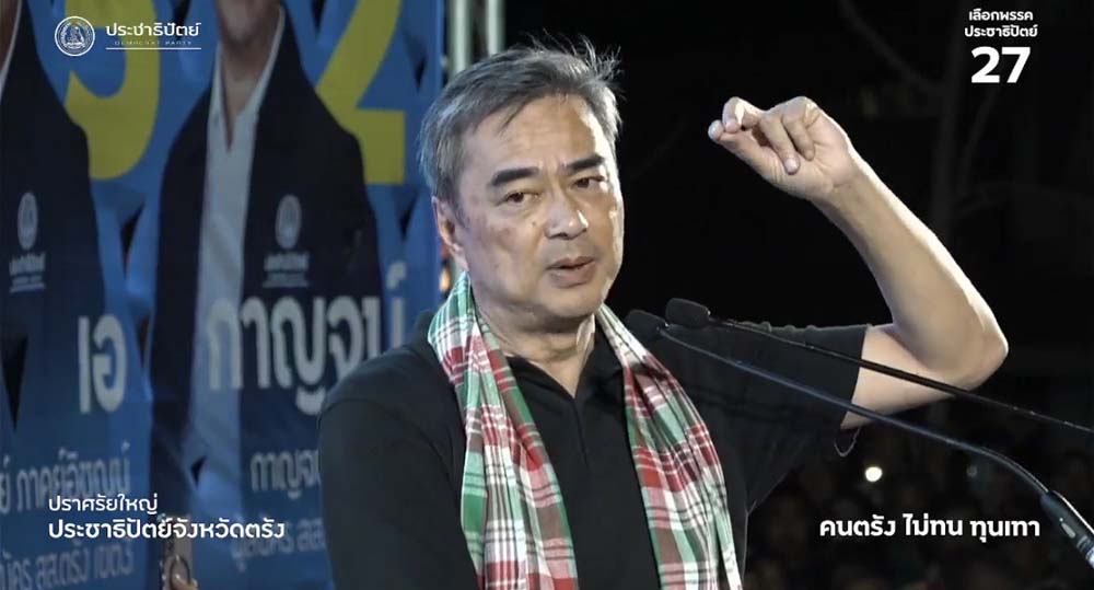 นายอภิสิทธิ์ ยังระบุว่า 5 วันสุดท้ายของการเลือกตั้ง ทุนเทาต่าง ๆ จะแปลงร่างเป็นแบงก์เทา คนใต้อาจถูกจดชื่อไปแล้ว แต่ถ้าแบงก์เทามาให้ถ่ายภาพเซลฟี่คู่กับตนแล้วบอกว่า 1 ใบไม่พอ ถ้า 2 ใบตนจะมาปราศรัยอีกจะได้ 3 ใบ แต่ไม่ว่าจะได้ 1 ใบ 2 ใบหรือ 3 ใบ แต่คนตรังอย่าเลือก เพราะ 4 ปีกับเงิน 1,000 บาทไม่คุ้มกับการให้นักการเมืองเข้าไปโกงกินกว่าแสนล้าน ทำลายโอกาสลูกหลาน และประเทศ และต้องรออีก 4 ปี ดังนั้น จะต้องหยุด และกลับไปคิด 30 ปีที่ผ่านมา หรือ 50 ปี ที่คนใต้กับพรรคประชาธิปัตย์ เคียงคู่ต่อสู้กับสิ่งที่ไม่ถูกต้อง ครั้งนี้จะต้องชัดเจนกว่า 8 กุมภาพันธ์ จะต้องไล่คนซื้อเสียงออกจากตรัง และภาคใต้ให้หมด ไม่จำนวนต่อเรื่องเงิน หรือทุนไม่ว่าสีใด แต่จะต้องร่วมกันสร้างบ้านเมืองสุจริต ทำเศรษฐกิจให้ดี ชีวิตประชาชนจะมั่นคง และไทยจะได้หายจนด้วยการเลือกพรรคประชาธิปัตย์ ทั้งบัตร 2 ใบ