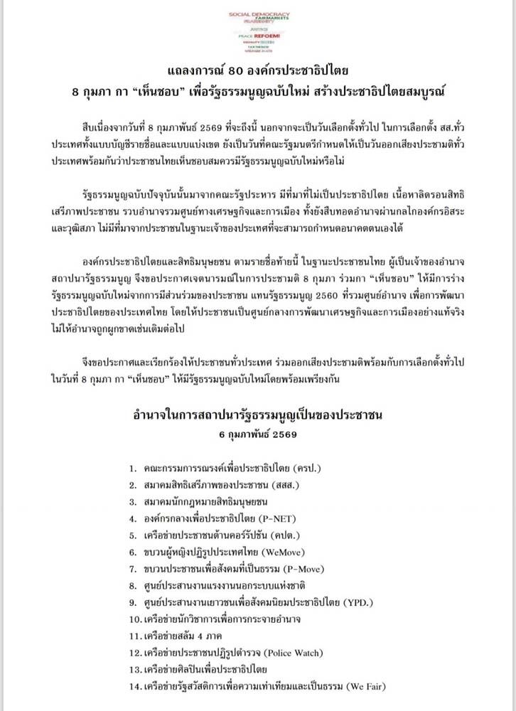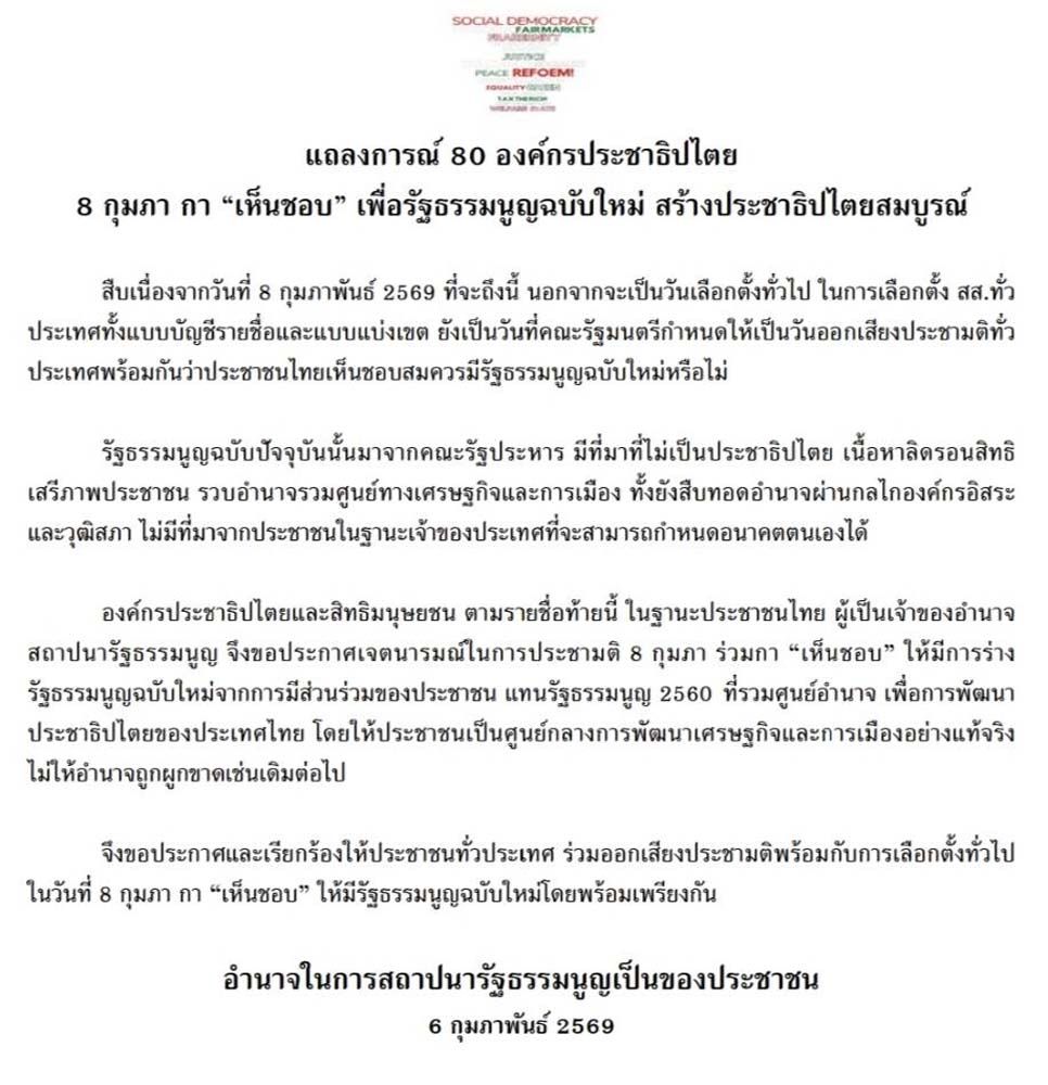 6 กุมภาพันธ์ 2569 "80 องค์กรประชาธิปไตย" ออกแถลงการณ์ประชามติ 8 กุมภา กา "เห็นชอบ" สมควรให้มีรัฐธรรมนูญฉบับใหม่ เพื่อนำไปสู่การร่างรัฐธรรมนูญจากการมีส่วนร่วมของประชาชน แทนรัฐธรรมนูญฉบับ 2560 ที่รวมศูนย์อำนาจและบังคับใช้มาเกือบ 10 ปีแล้วหลังการรัฐประหาร โดยมีรายละเอียดแถลงการณ์ ดังนี้