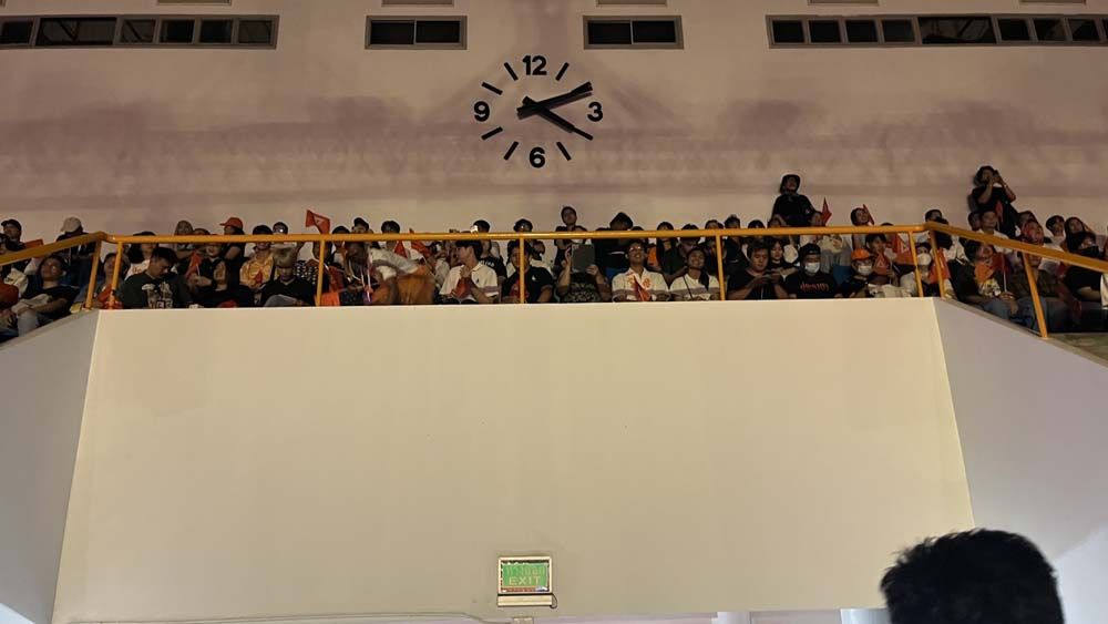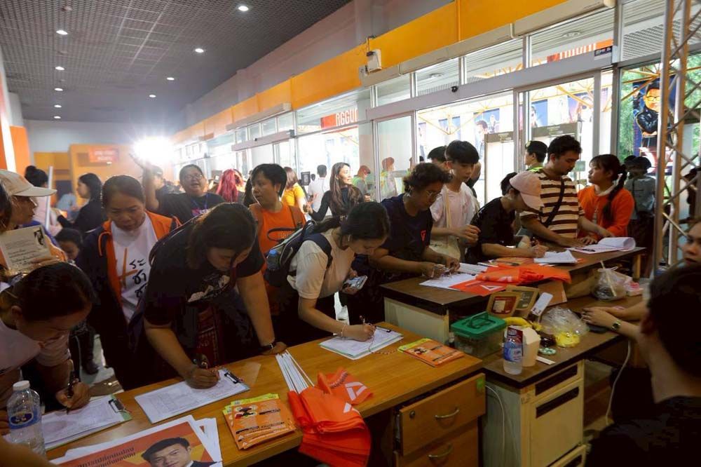 โดยเวลา 14.00 น. เจ้าหน้าที่ได้เปิดให้แฟนคลับที่มารอเข้ามา ซึ่งประชาชนผู้สนับสนุนพรรคได้วิ่งกรูเข้ามาอย่างล้นหลาม หยิบเบาะที่นั่งมาจับจองพื้นที่รอบๆเวทีจนแน่น ขณะที่รอบนอก ในสนามหญ้าข้างอาคาร พรรคประชาชนได้สร้างประตูเป็นสีต่างๆ ประจำพรรคการเมืองที่ลงแข่งเลือกตั้งรอบนี้ เช่น สีแดง สีส้ม สีน้ำเงิน เพื่อให้ประชาชนได้ลองเล่นว่าอยากเปิดประตูบานไหน