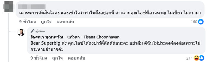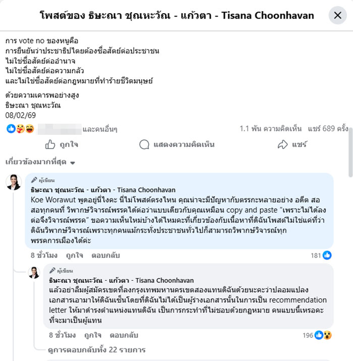 น.ส.ธิษะณา ยังได้ตอบโต้ผู้มาคอมเมนต์ด้วยว่า "พูดอยู่นี่ไงคะ นี่ไม่โพสต์ตรงไหน คุณน่าจะมีปัญหากับตรรกะหลายอย่าง อดีต สอสอทุกคนที่ วิพากษ์วิจารณ์พรรคได้ต่อว่าแบบเดียวกับคุณเหมือน copy and paste “เพราะไม่ได้ลงต่อจึงวิจารณ์พรรค” ขอความเห็นใหม่บ้างได้ไหมคะที่เกี่ยวข้องกับเนื้อหาที่ดิฉันโพสต์ไม่ใช่แค่ที่ว่าดิฉันวิพากษ์วิจารณ์เพราะทุกคนแม้กระทั่งประชาชนทั่วไปก็สามารถวิพากษ์วิจารณ์ทุกพรรคการเมืองได้ค่ะ"