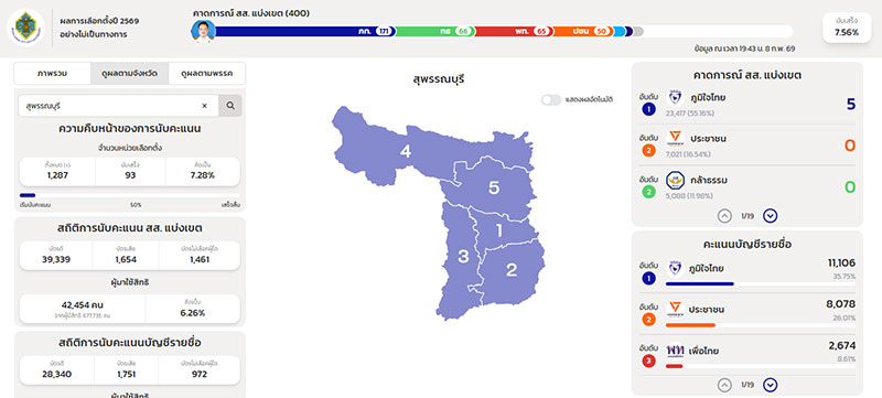 ล่าสุด เวลา 20.30 น. ผลการนับคะแนนอย่างไม่เป็นทางการของเว็บไซต์ กกต. จ.สุพรรณบุรี โดย สส.แบ่งเขต มีคะแนนนำมาเป็นอันดับที่ 1 ทั้ง 5 เขต มีดังนี้