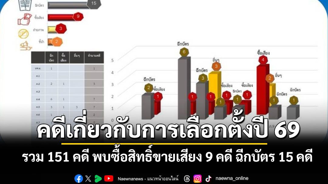ศลต.ตร. เปิดสถิติคดีเกี่ยวกับการเลือกตั้ง สส.ปี 69 พบซื้อสิทธิ์ขายเสียง 9 คดี ฉีกบัตร 15 คดี ยังพบทำลายป้ายหาเสียง ใส่ร้าย หมิ่นประมาท คุกคาม ไปจนถึง พ.ร.บ.คอมพิวเตอร์ รวม 151 คดี ภายในเวลาไม่ถึง 2 เดือน โดยพรรคประชาชนถูกทำลายป้ายมากที่สุด คิดเป็นเกือบ 38% ขณะที่ตำรวจยังเร่งสืบสวนขยายผลเอาผิดผู้กระทำผิดทั่วประเทศ