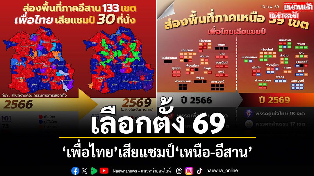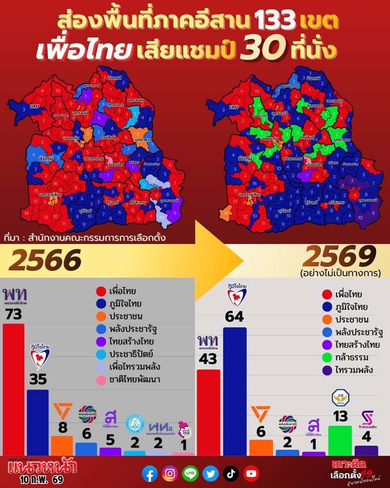 จากการเลือกตั้งสมาชิกสภาผู้แทนราษฎร ทั้งแบบแบ่งเขต แบบบัญชีรายชื่อ และการออกเสียงประชามติ เมื่อวันที่ 8 กุมภาพันธ์ 2569 ที่ผ่านมา และมีการทราบผลคะแนนในวันที่ 9 กุมภาพันธ์ 2569 แม้ยังไม่เป็นทางการ พบว่า ผลการเลือกตั้ง สส.เขตในพื้นที่ภาคเหนือและภาคตะวันออกเฉียงเหนือ (อีสาน) ซึ่งเคยเป็นฐานเสียงสำคัญของพรรคเพื่อไทย ได้เกิดการเปลี่ยนแปลงอย่างมีนัยสำคัญ